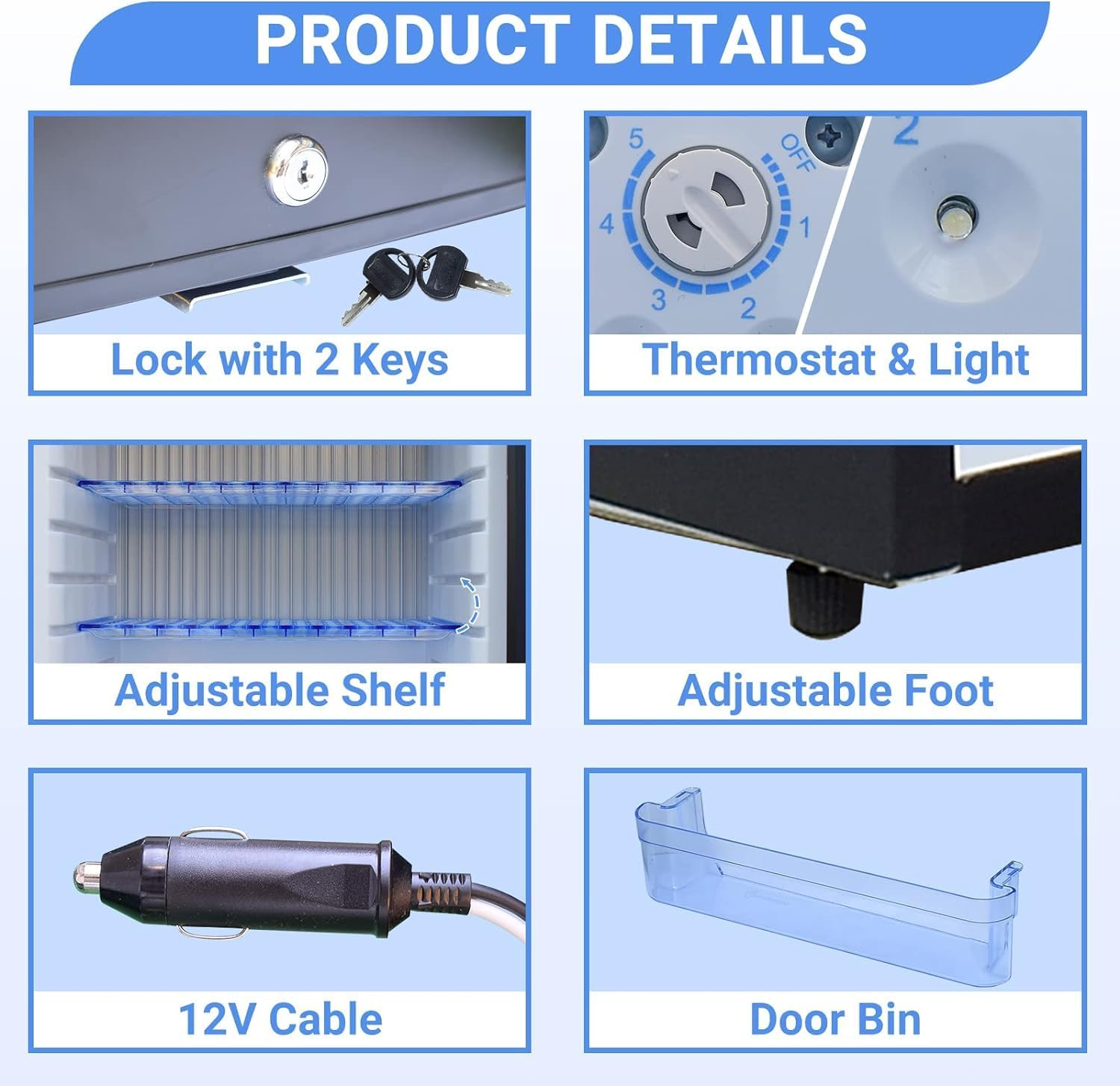 - [Versatility for RV fridge]: 1.6 Cu.Ft Compact tall fridge equipped with Reversible door, removable shelves, with door bins, Lock & keys, 12V/110V cables, LED lighting; This 12v mini fridge can be installed under a counter, countertop, or freestanding