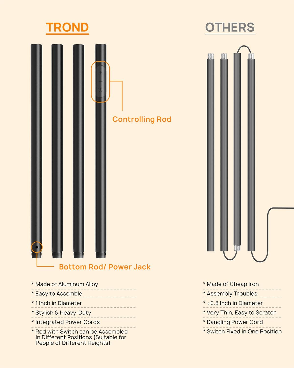 - Modern Warm Light Floor Lamp: This warm light floor lamp innovatively features 4 modular aluminum rods, all of which have the integrated power cords built inside. This design gives you the convenience and flexibility to assemble, disassemble and adjust the height. Its total height is 180 cm/71 in, taller than other similar lamps, so that you won’t stare directly at the bright light