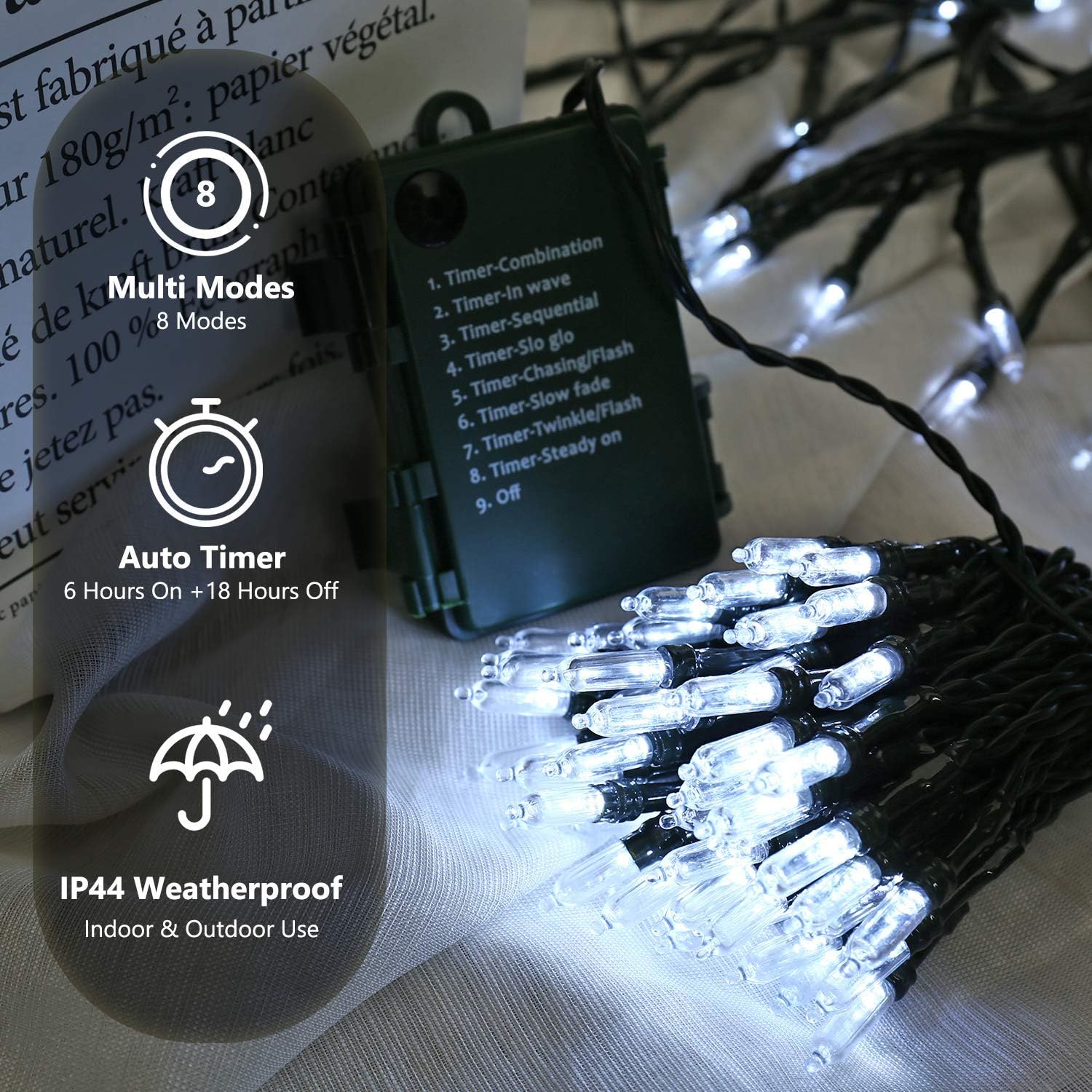 - 8 Modes & Auto Timer: These clear cool white string lights have 8 gorgeous lighting modes with built-in auto-timer 6 hours "ON" and 18 hours "OFF", which starts once you activate any one of the 8 modes on the battery holder, so it will automatically time when the light is on. Note: If you change modes before the timer expires then it will stay on that mode for another 6 hours.