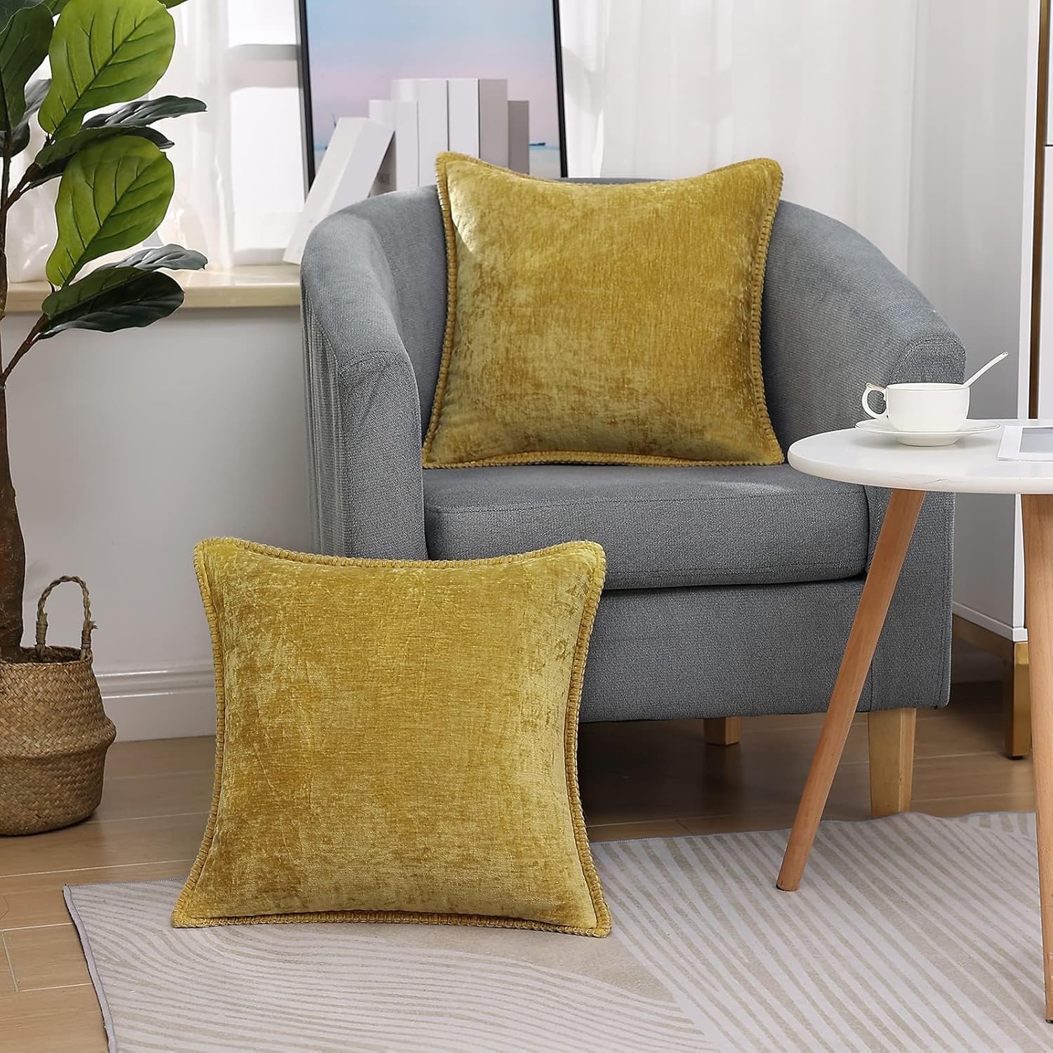decorUhome Chenille Soft Throw Pillow Covers 20x20 Set of 2, Farmhouse Velvet Neutral Decorative Euro Pillow Covers with Stitched Edge for Couch Sofa Bed Home Decor, Mineral Yellow