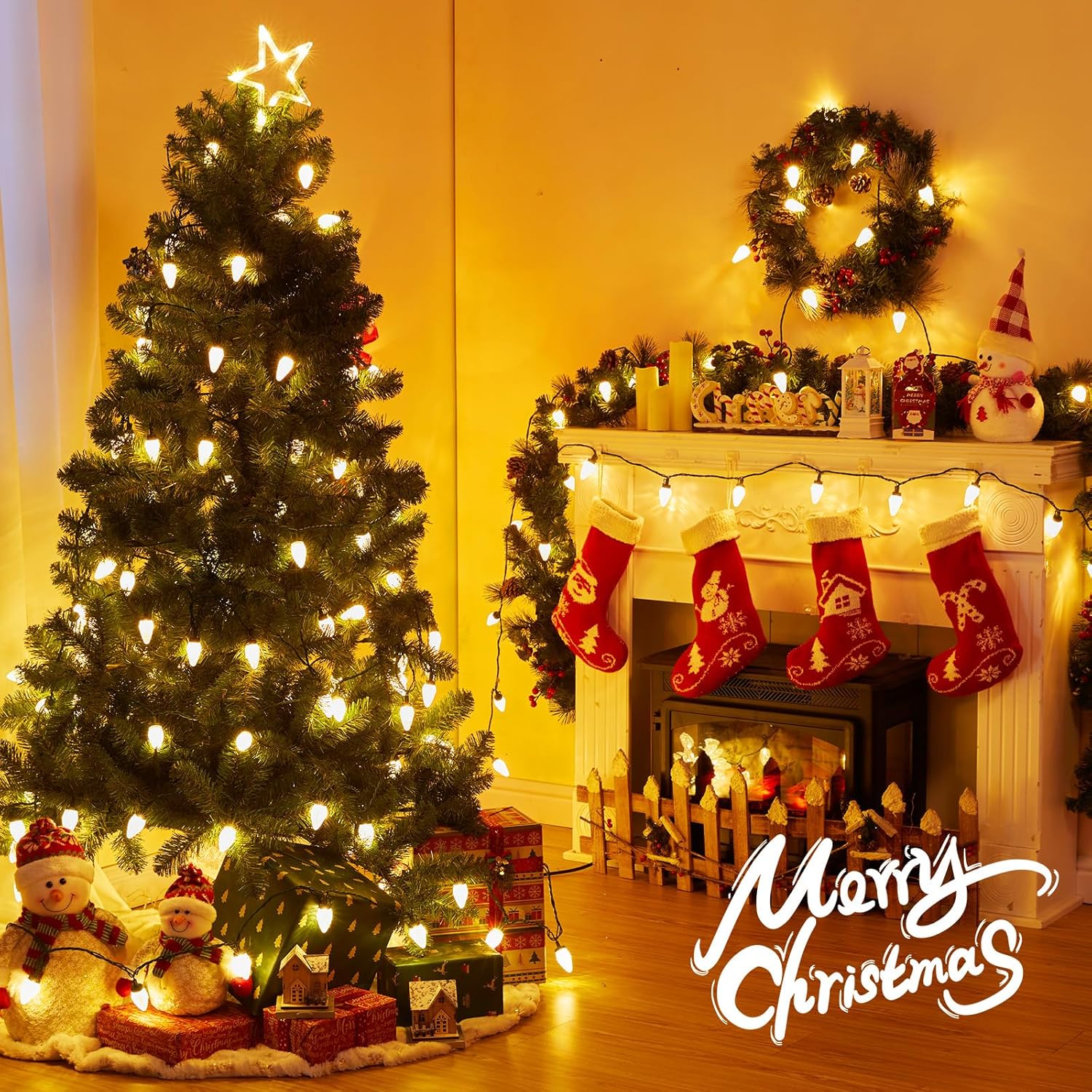 Brightown C9 LED Christmas String Lights, 33ft 50 LED Waterproof Strawberry String Lights, Plug-in Extendable Green Wire Lights String for Outdoor Indoor Patio Party Decoration, (Warm White)