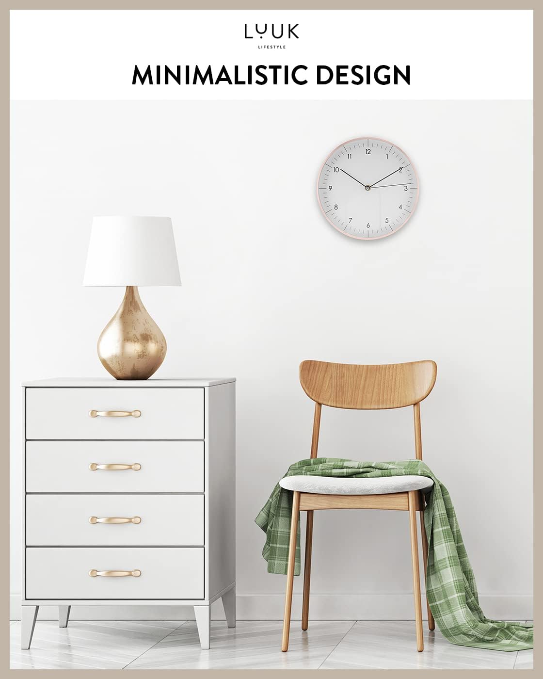 LUUK LIFESTYLE Timeless Wall Clock with Silent Movement and no Ticking, Elegant Design, for Children's Room, Living Room, Bathroom, 12”, White and Rosegold