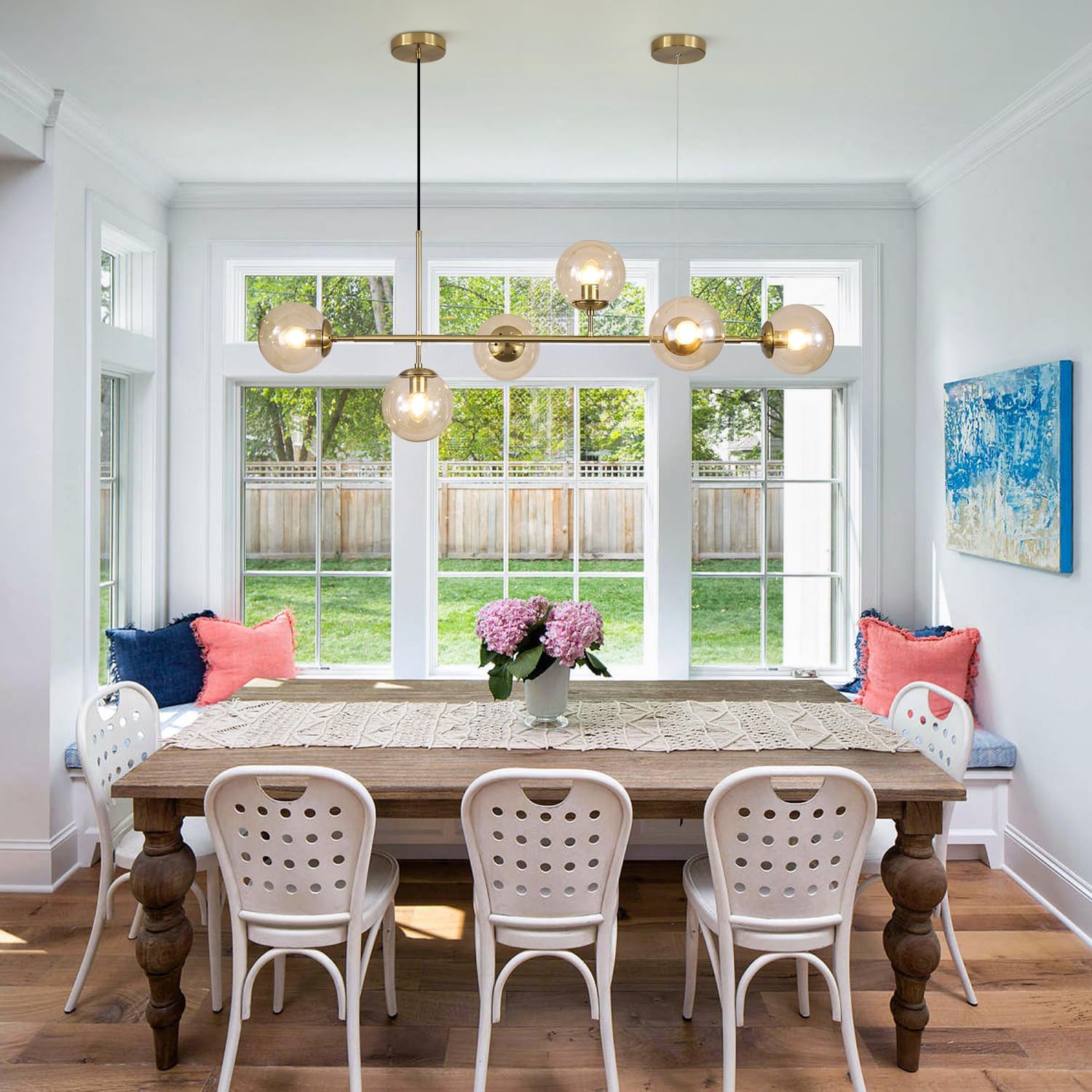 KCO Lighting Globe Linear Chandelier 6 Light Amber Glass Pendant Light Fixture Gold Kitchen Island Lighting Long Brass Sputnik Chandelier Dining Room Light Fixtures Over Table