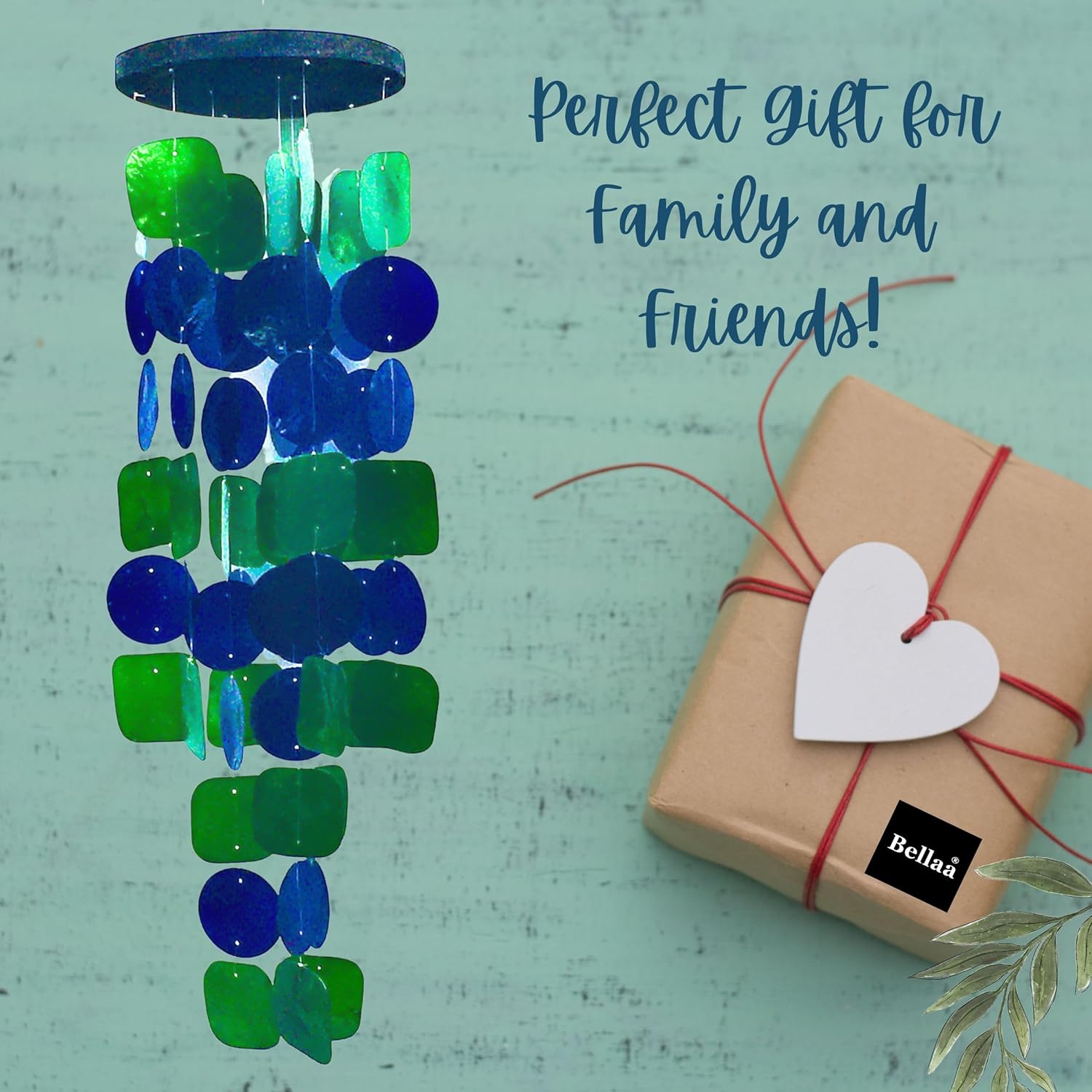 Bellaa 24858 Wind Chimes Outdoor, Garden Decorations, Musical, Indoor/Outside Windchimes, Beach, Ocean Breeze, Gifts for Mom, Gift for All Occasions, Capiz Sea Glass Shells Wood 27 inch Green Blue