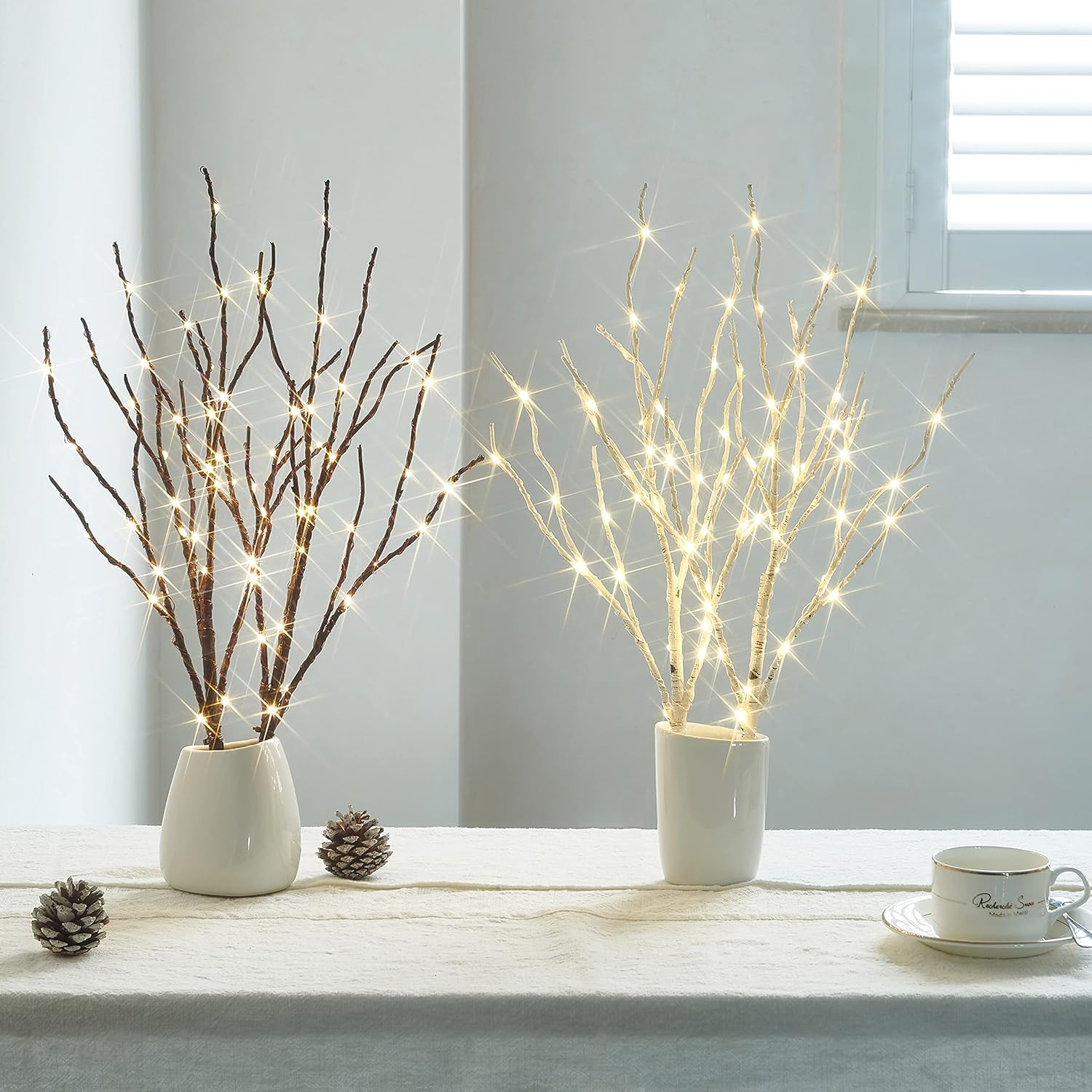 - 【LIFELIKE IN APPEARANCE】: Hand painted with realistic natural birch-inspired finish on the twig lights. IP44 waterproof nd 2pcs ground stakes included for taller vase use or outdoor patio, porch, party, wedding or events celebrations decor