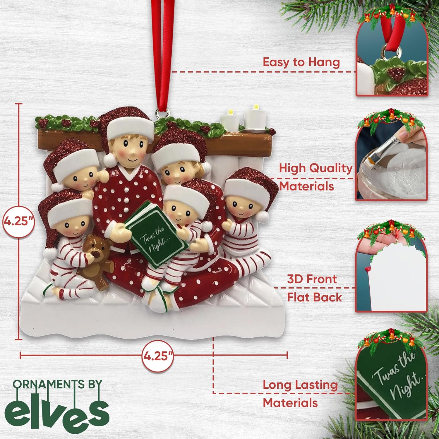 - 🎁 Celebrate Your Family of 6: Mark a joyful milestone with a personalized family of 6 Christmas ornament 2025. Whether it’s your first year as six or part of a cherished tradition, this keepsake honors your growing bond and tells your story with warmth, love, and festive cheer. This bedtime Christmas story ornament captures a magical moment with a family of six in striped pajamas, all wearing glittery red Santa hats. They’re cozied up while holding ’Twas the Night… book, surrounded by soft details like a teddy bear and holiday candles for extra warmth.