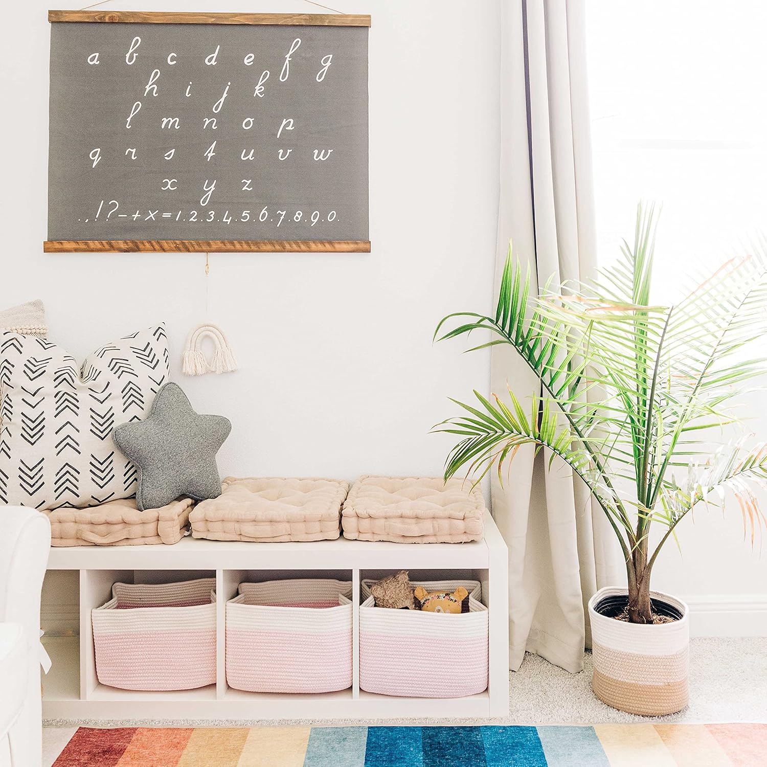 - Discrete, Built-In Carry Handles – These fabric rope baskets for storage also feature slim hand holds built right into the sides of each basket for a seamless look that’s also functional. Perfect for picking up toys or carrying items around the house.