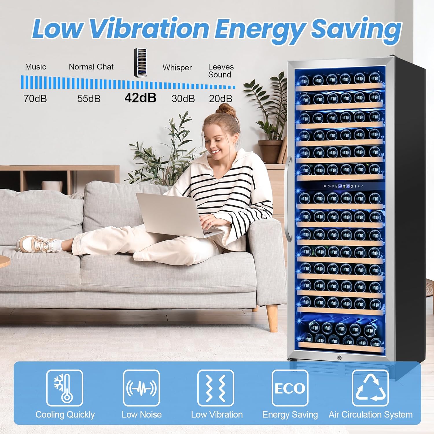 - 180 Bottles Capacity: The wine cooler can hold up to 180 standard wine bottles to meet your large storage needs; The adjustable and removable wooden shelves provide easy access and allow you to optimize your storage space according to your preferences