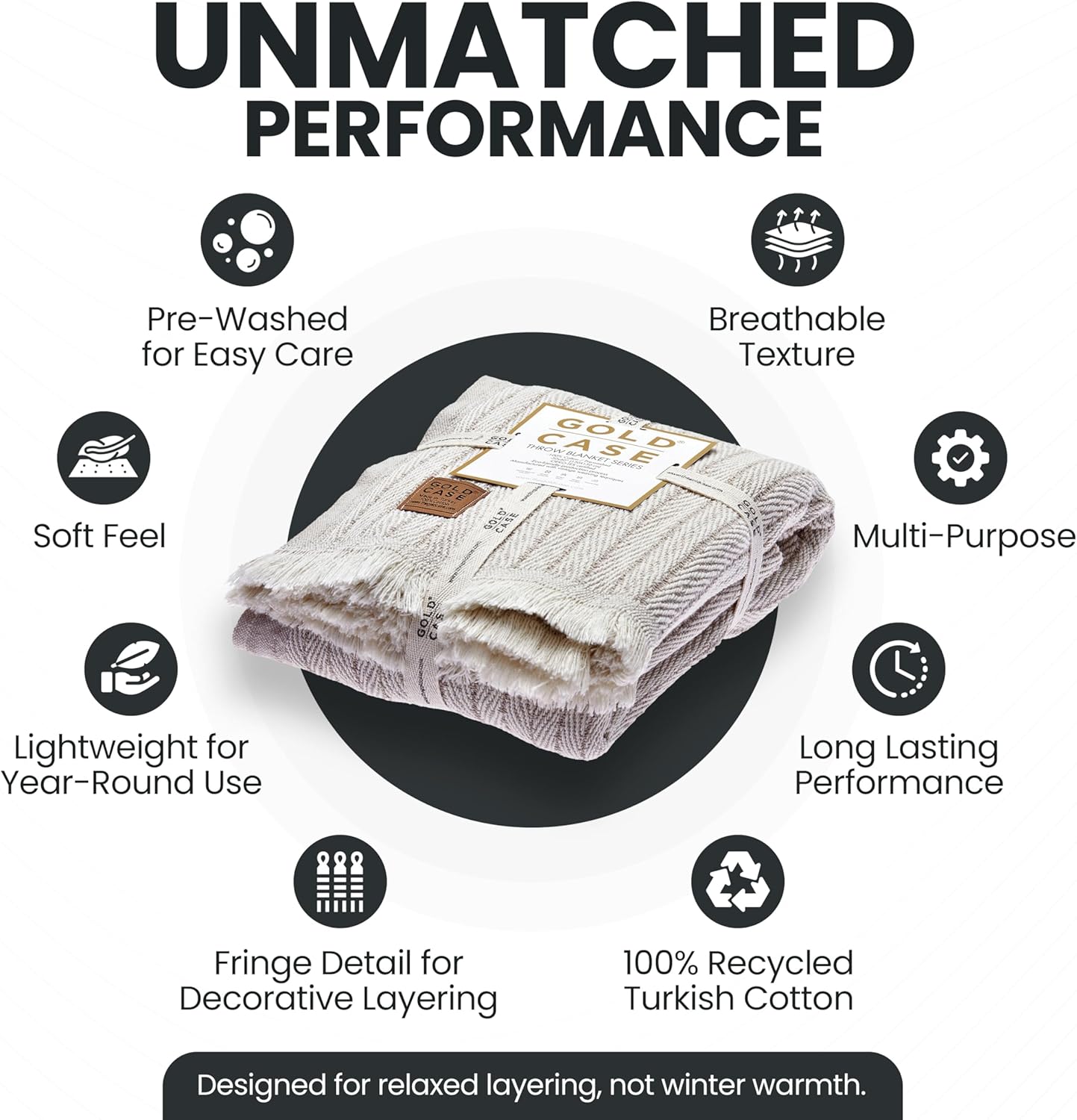 Gold Case Throw Blanket for Couch – 100% Recycled Turkish Cotton Blankets & Throws – Elegant Decorative Throw Blankets for Living Room Sofa – Woven Throws for Couch – Vintage Beige – 50x60