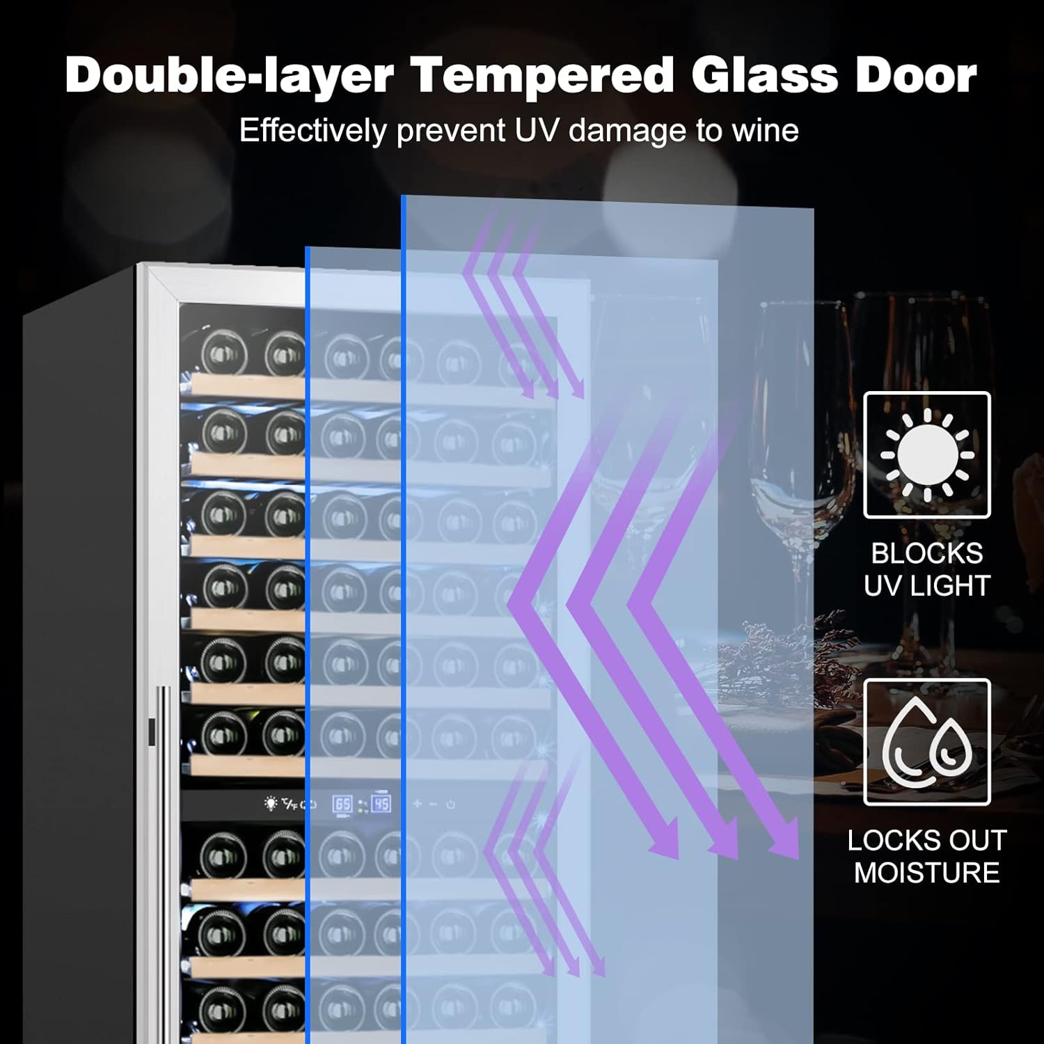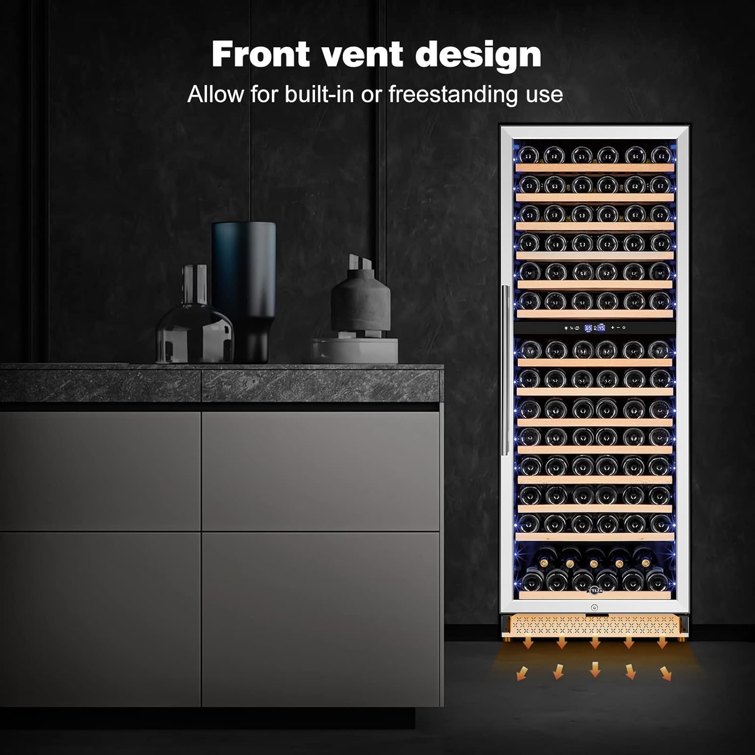 - 180 Bottles Large Capacity:The 24'' dual zone wine fridge features 14 beech wooden shelves that can store up to 180 bottles of standard Bordeaux (750 ml) wine and the bottom shelf has large capacity that you can load large bottles;Durable beech wooden shelves No shake No damage bottle when sliding in or out;
