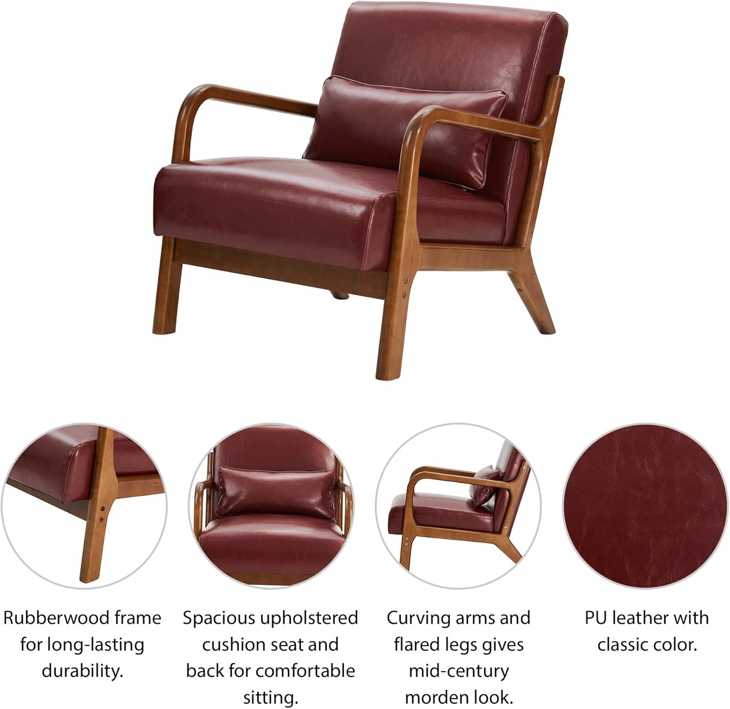 Glitzhome 30.75" H Mid Century Red Accent Armchair, Single Reading Armchair PU Leather Lounge Chair with Walnut Ruberwood Frame