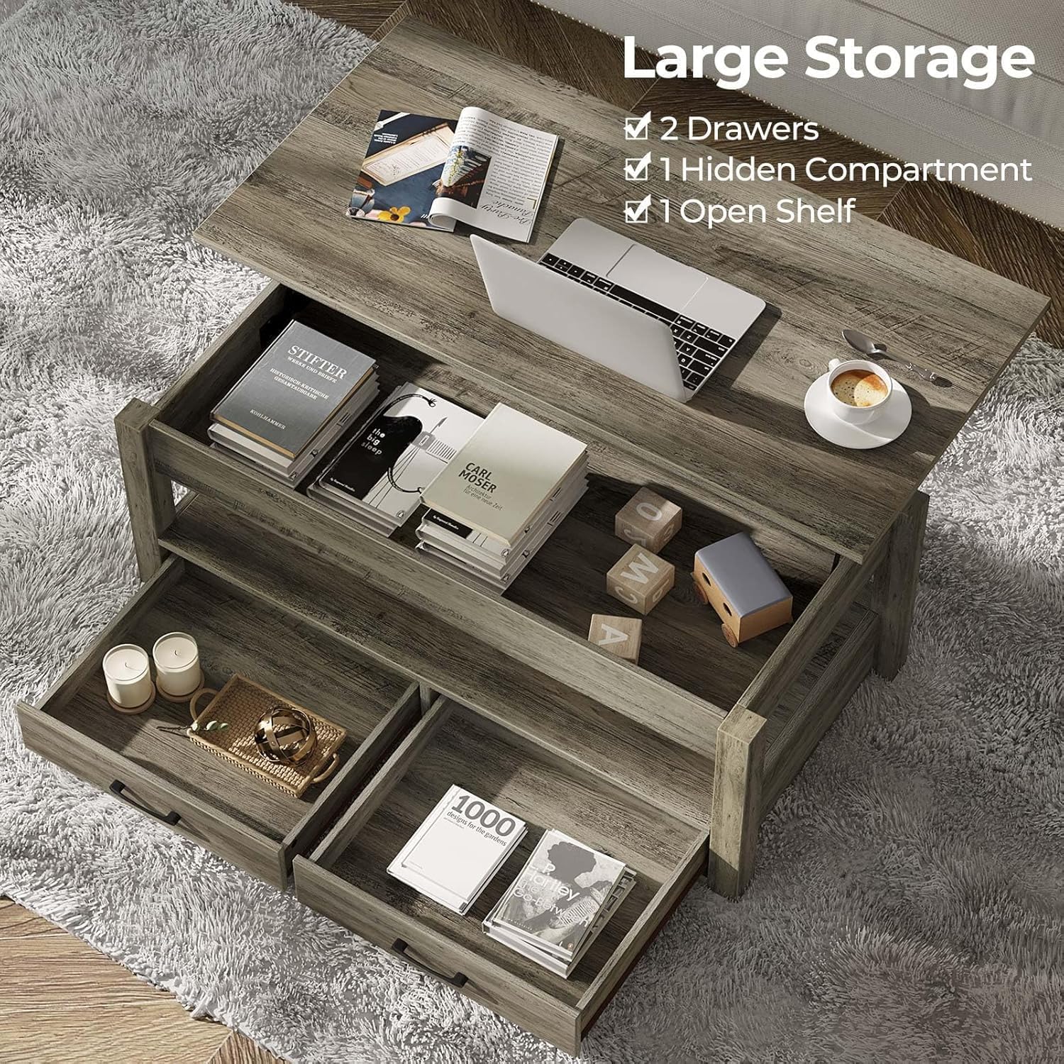 Rolanstar Coffee Table, 47.2" Lift Top Coffee Table with Drawers and Hidden Compartment, Retro Central Table with Wooden Lift Tabletop, for Living Room, Washed Oak