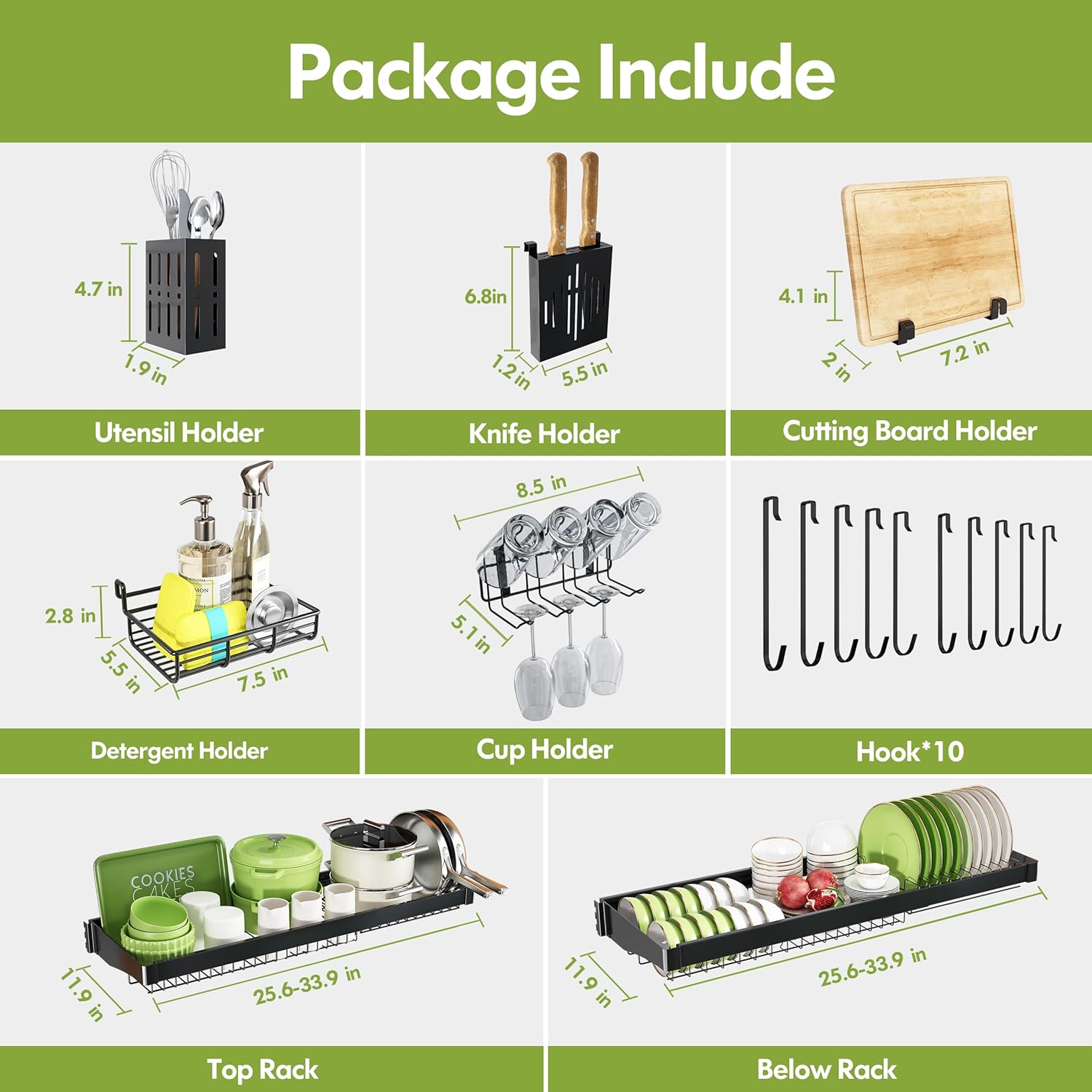 - 🧺 Multi Level Storage Efficiency: Three spacious tiers organize dishes by type, large cookwares on top, bowls and plates in the middle, while dedicated sponge holder and hanging hooks keep sponges and brushes accessible. The dish rack over sink open grid design accelerates drying by promoting airflow, reducing water spots