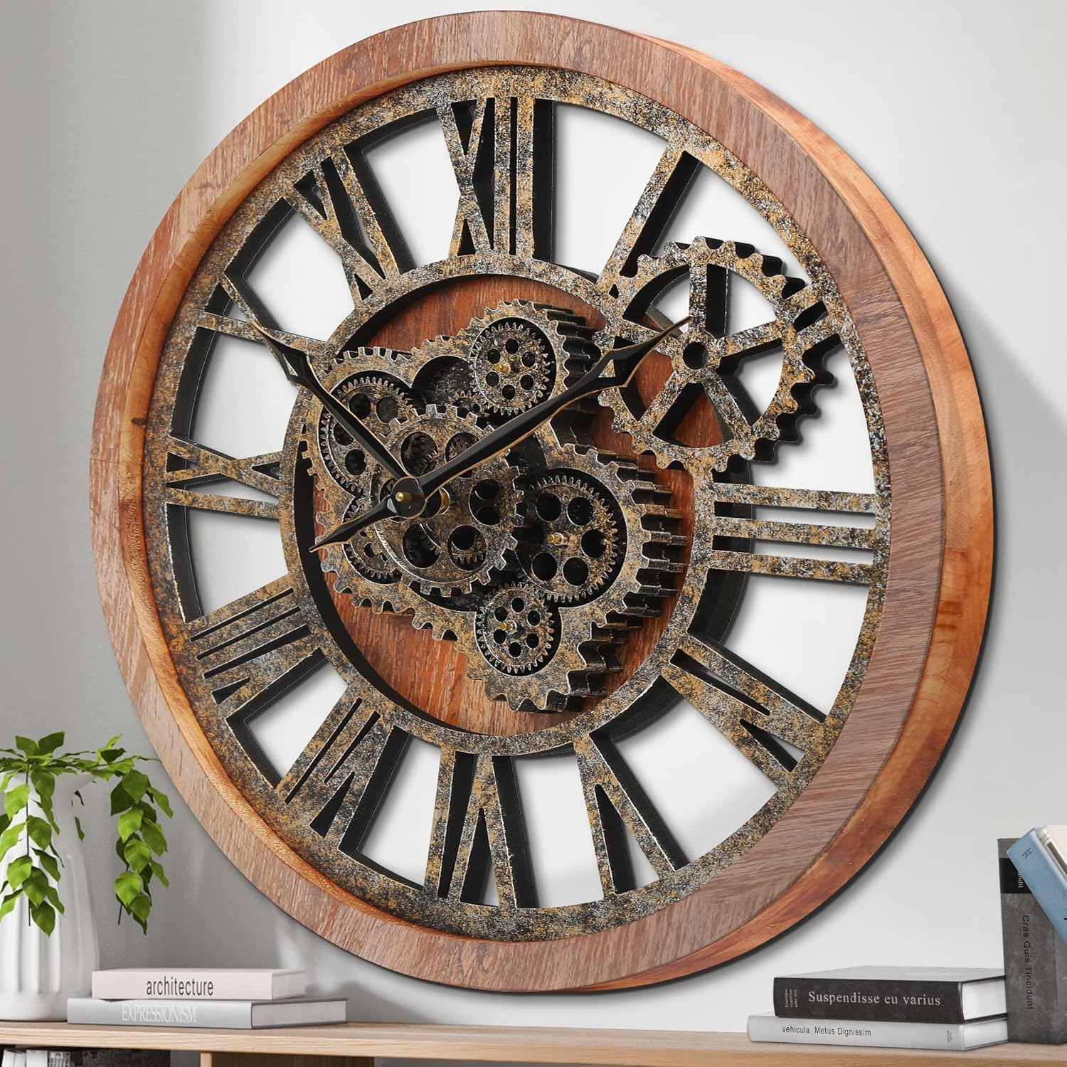 - 【Real Moving Gear Clock】All gears for the wall clock are real moving! Design with rustic bronze-color and industrial style. An creative combination of four gears for a retro look, has a very exquisite decorative effect makes the wall clock become a chic art works. The large wall clock crafted of nature wood & MDF. Big roman numeral numbers and wood rustic moving gears perfect for any room decor.