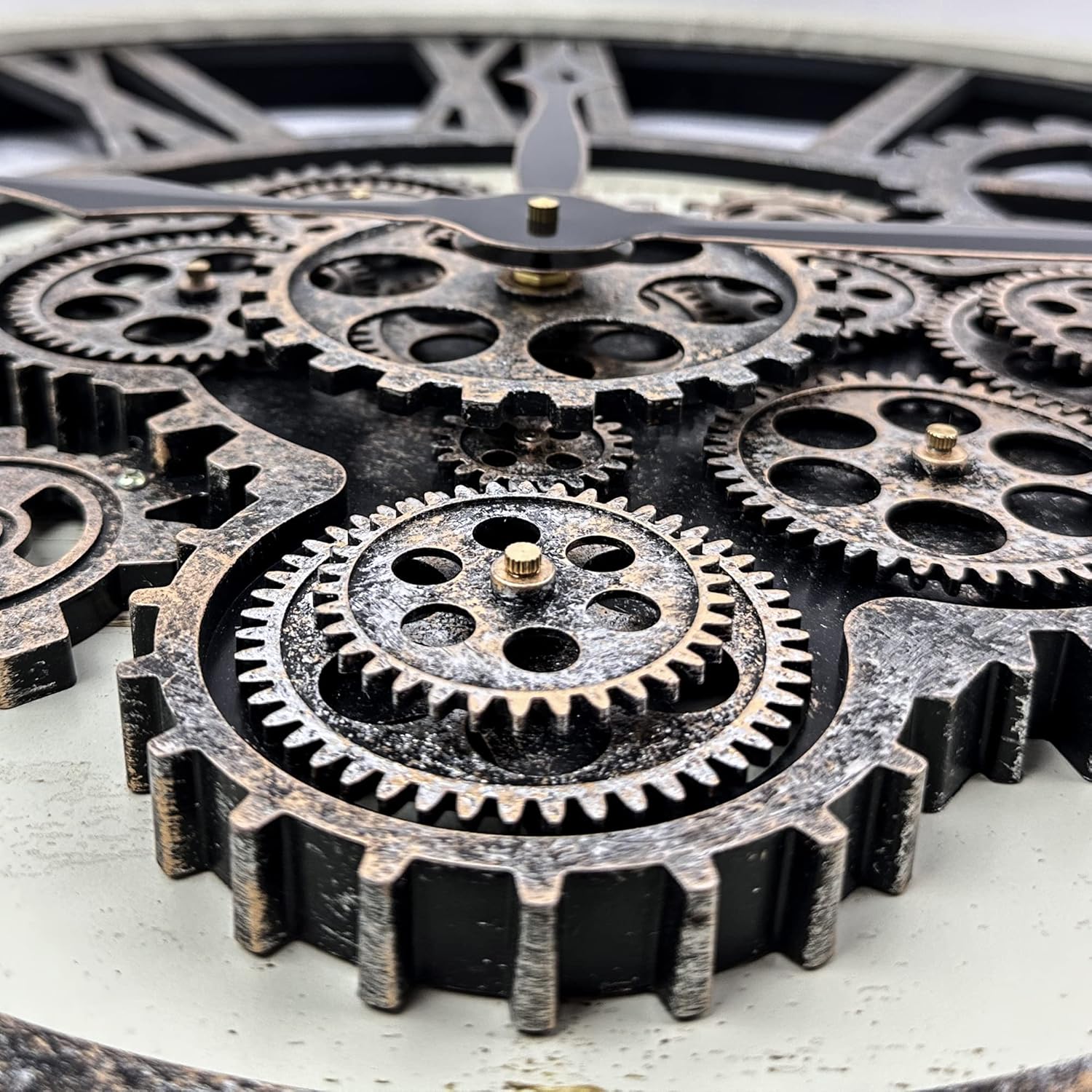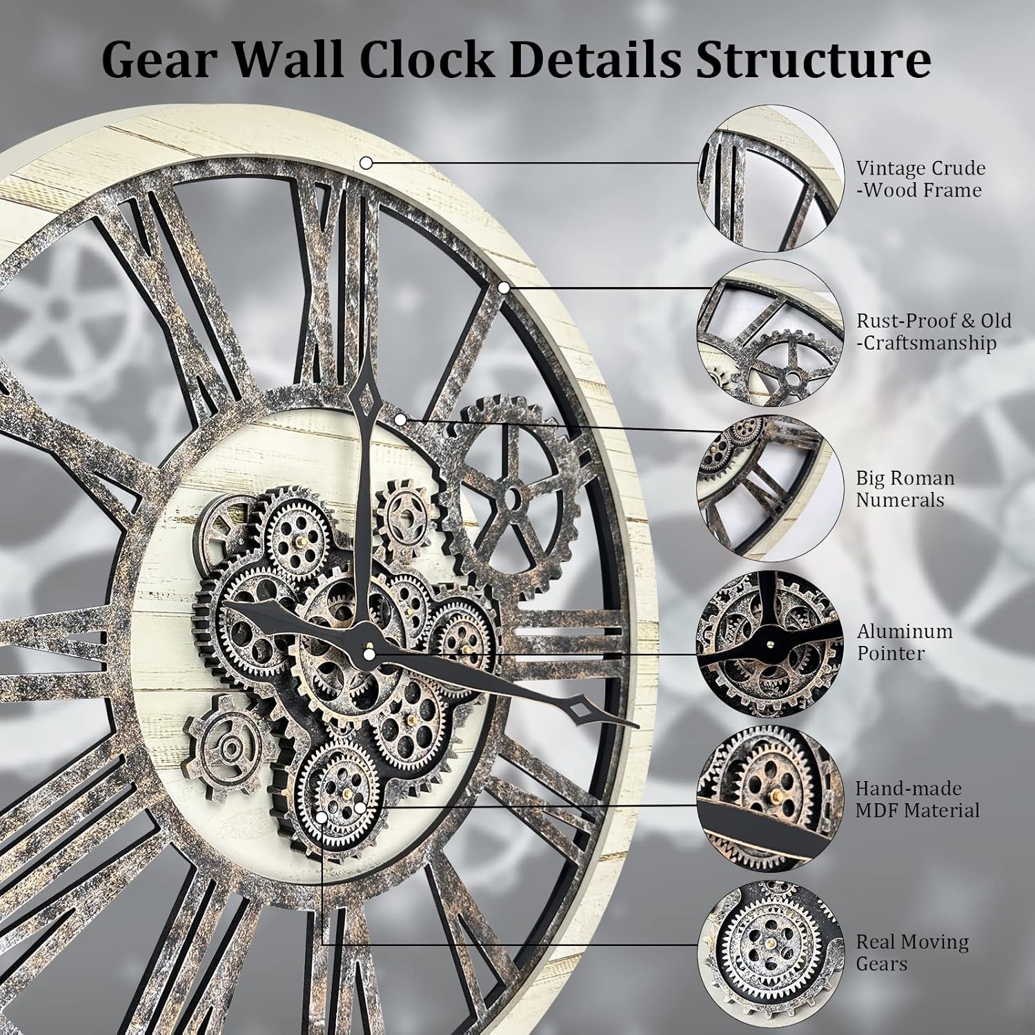 - 【Real Moving Gear Clock】All gears for the wall clock are real moving! Design with rustic bronze-color and industrial style. An creative combination of four gears for a retro look, has a very exquisite decorative effect makes the wall clock become a chic art works. The large wall clock crafted of nature wood & MDF. Big roman numeral numbers and wood rustic moving gears perfect for any room decor.