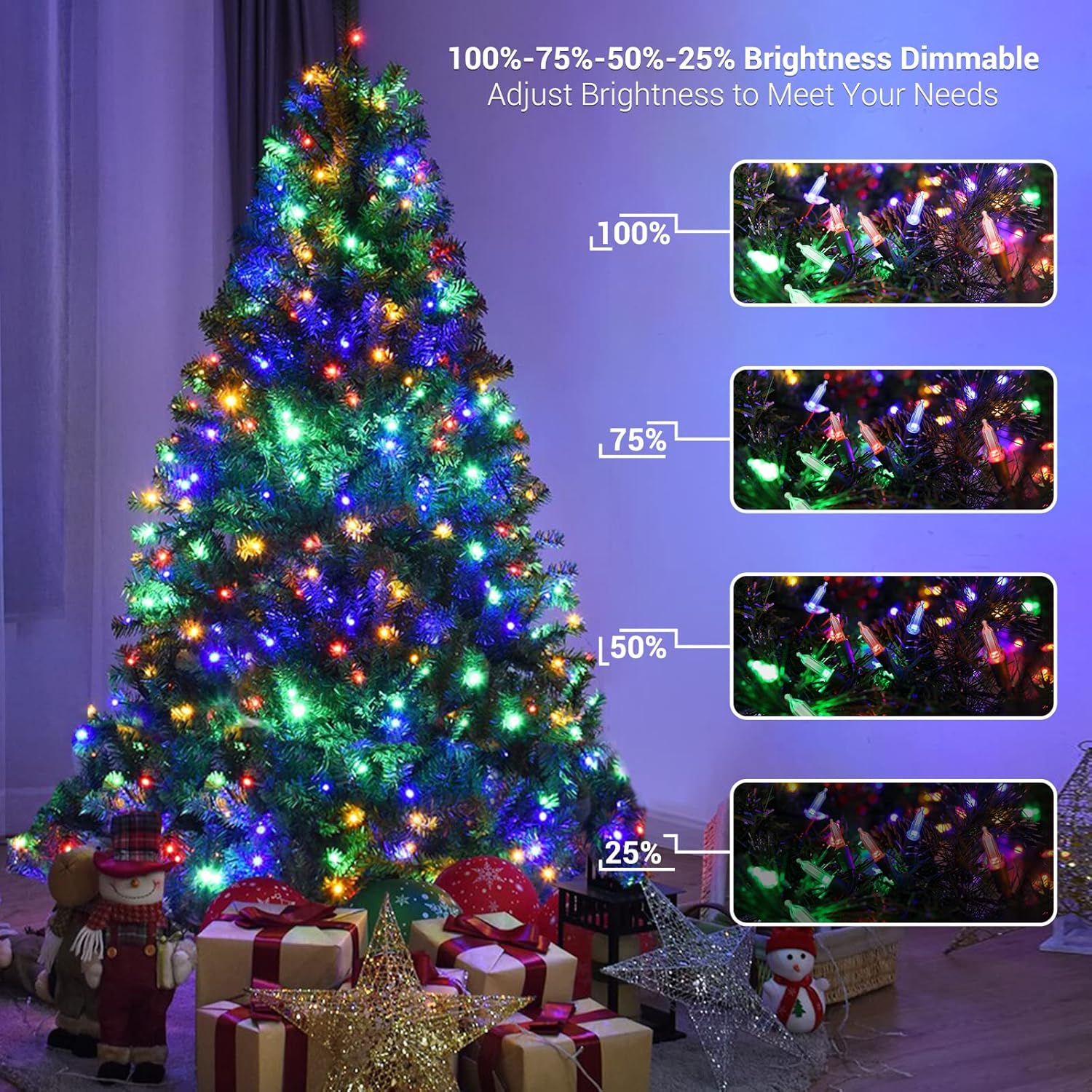 - Dimmable LED Color Changing Christmas String Lights with memory function: 100%-75%-50%-25% 4 level brightness, create suitable, comfortable atmospheres at your needs according to various occasions. Noted: While in multicolor modes, all the colors (including red, yellow, blue and green) will be shown together, no specific colors can be set up! Built-in memory function, remember your last mode, no need to reset every time.