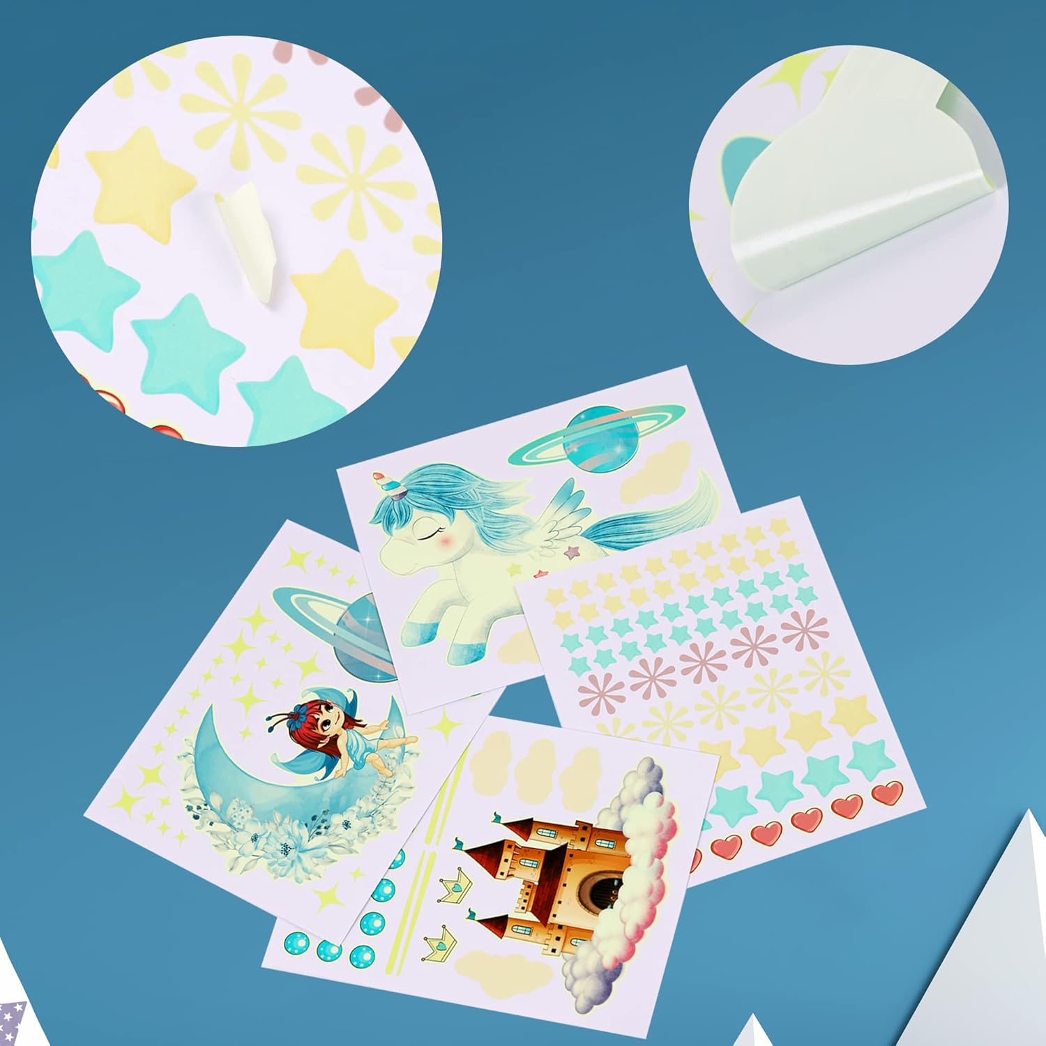 - 【Package Includes】: You will get 4 sheets of unicorn wall decals, Contains 1 unicorn, 1 moon fairy, 1 castle, 2 planets and other 141 accessories such as stars and dots, which made from high quality, glossy, luminous, glowing, fluorescent wall stickers. Various shapes and sizes for you to choose, enough quantity can meet your different decorative needs, and add more nature atmosphere.