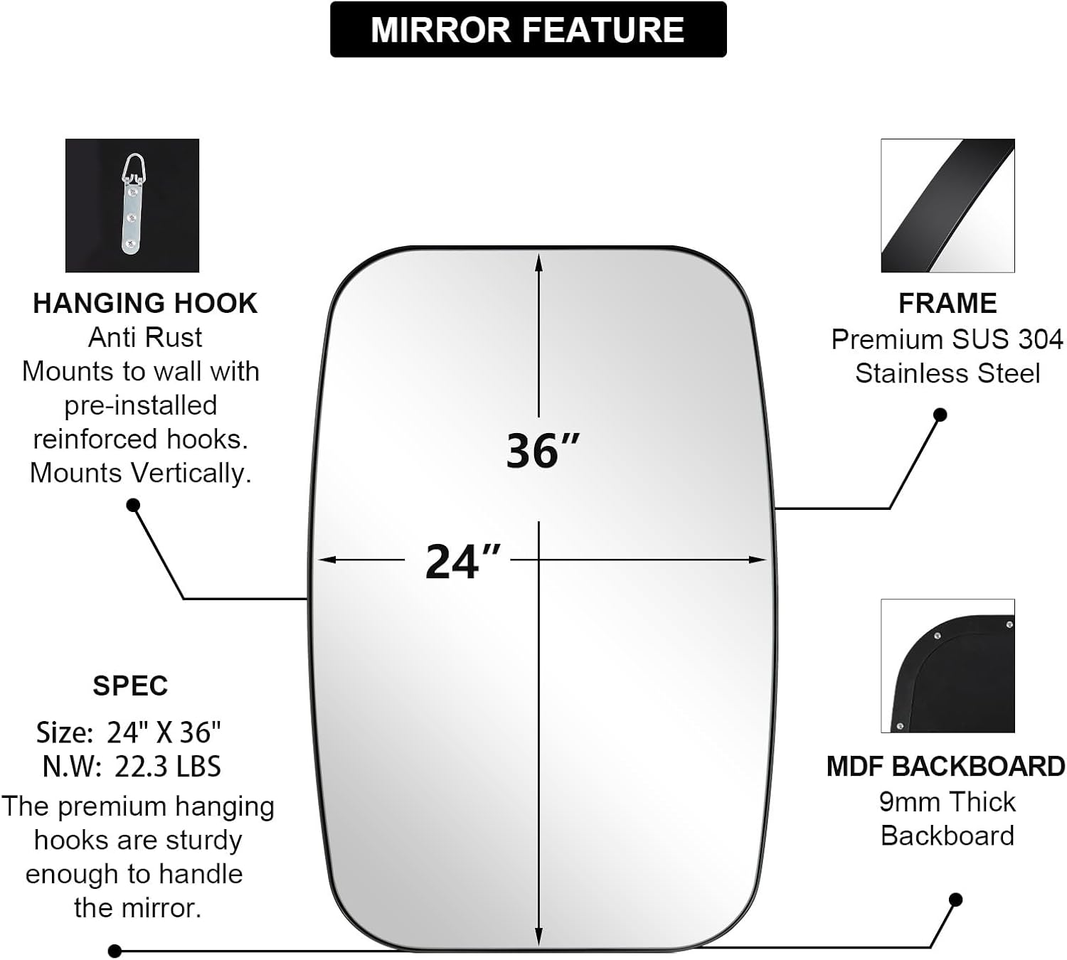 - Maximize Limited Wall Areas: Maximize your bathroom's wall space with the 24 x 36 inch mirror. Its versatile size and clear, distortion-free reflection make it perfect for narrow spaces, offering both practicality and aesthetic appeal in confined areas