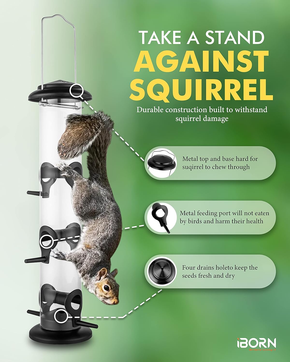 - 【Metal Bird Feeder】Metal top & base, aluminium feeding ports survived from Squirrel Damaging. Durable quality to sustain wear and worn outdoors. We adopt advanced technique for metal finishing to help the metal last longer when used outdoors.