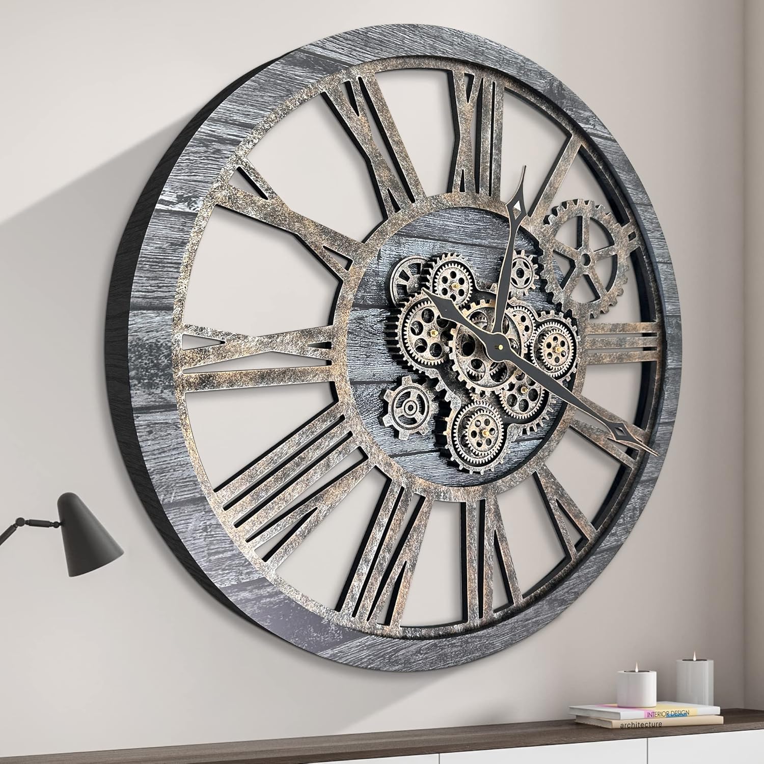 - 【Real Moving Gear Clock】All gears for the wall clock are real moving! Design with rustic bronze-color and industrial style. An creative combination of four gears for a retro look, has a very exquisite decorative effect makes the wall clock become a chic art works. The large wall clock crafted of nature wood & MDF. Big roman numeral numbers and wood rustic moving gears perfect for any room decor.