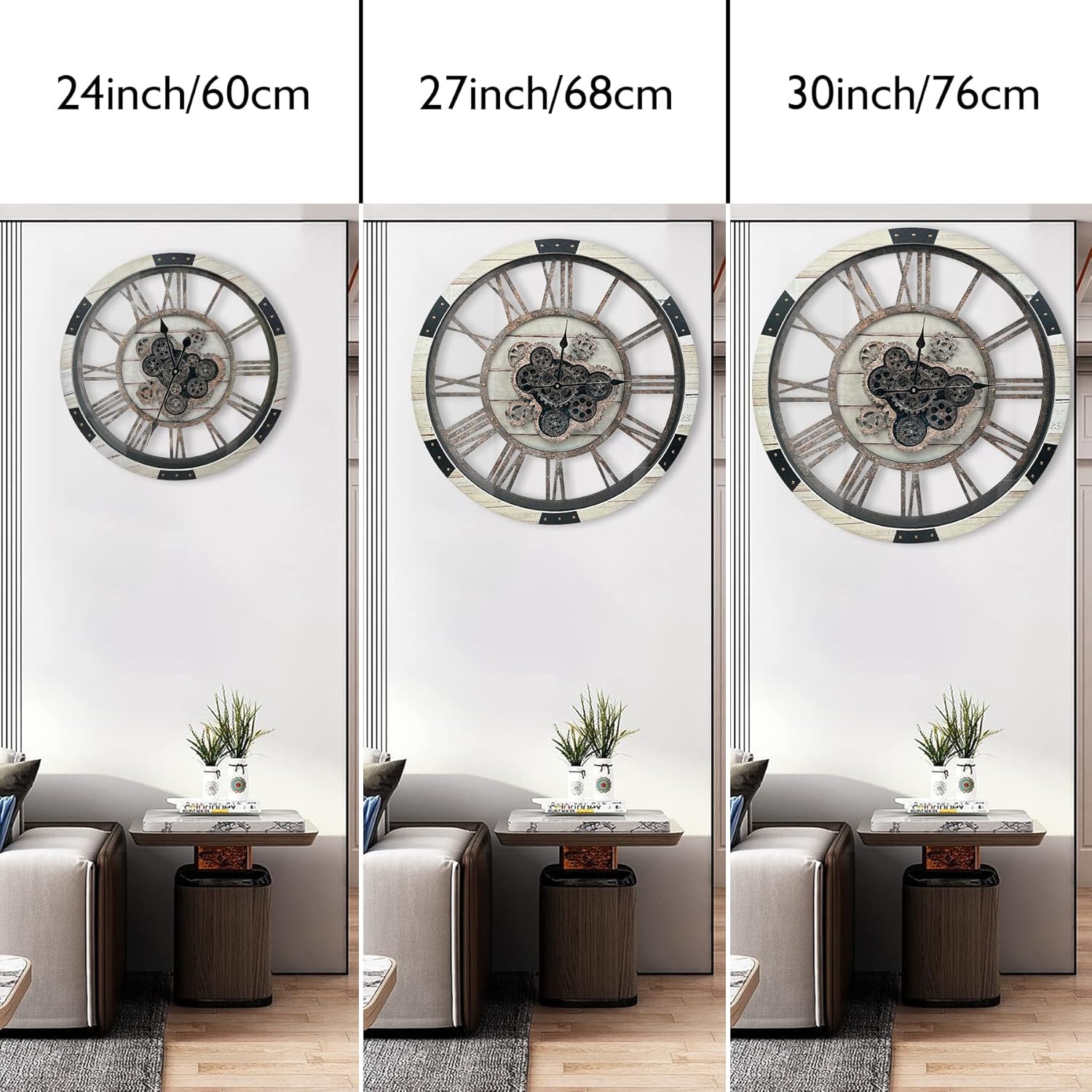- 🧭【Oversized Clock and Silent Movement】 This farmhouse wall clock measures 24" (60CM) in diameter, 2.95'' (7.5CM) in depth, weight-10.12lbs (4.6kg), big size and heavy duty. Using high quality quartz movement material to run smoothly, ensuring accurate timing and absolute silence. Big Roman Numerals, HT toughened glass cover, you can easily read the time from any angle.