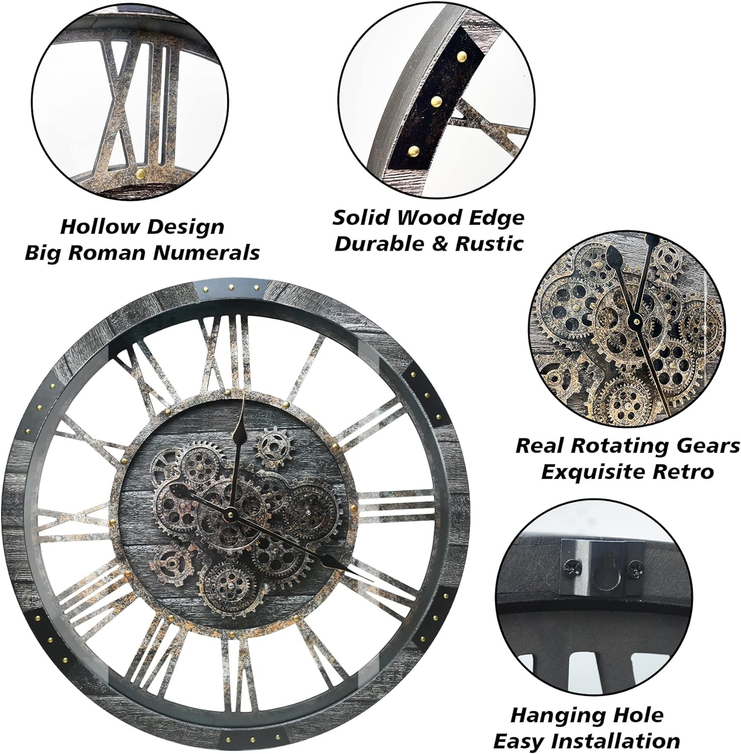 - 🧭【Unique Design, Only For Your Home】 Round solid Wood frame and classic retro metal skeleton with real mechanical moving gears in the central, the wooden frame is handcraft, showing unique attractive wood grain color and small natural knots; fake rust treatment marks on the metal skeleton for vintage and industrial effect; stronger tempered glass resists any breakage and keeps safety whenever;; The design is very different from other clocks, just to break the ordinary, only for your home