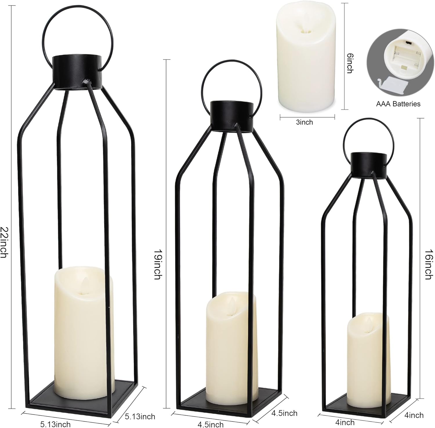 - 【Dimensions】:Our decorative candle lanterns are elegantly crafted of sturdy black metal frame. They are great lanterns decor for indoors and outdoors. Including the handle, the larger one measures 5.13 x 5.13 x 22 inch, the medium one measures 4.5 x 4.5 x 19 inch, the small one measures 4 x 4 x 16 inch. The included 3 LED candles measure 3 x 6 inch. Each candle requires 3 AAA batteries(NOT included).