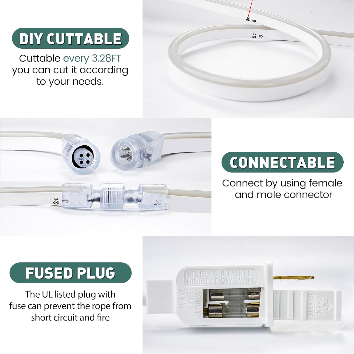 - Cuttable & Connectable--GZBtech AC 110-120V RGB led rope lights can be cut in every 3.28ft/1m along the cutting marks, you can cut it according to your needs. By using male and female connectors end to end, it can be easily connected and plug and play. Can also be hardwired by cutting off the plug. For a matching power cord please scroll down to the bottom of this page. Please note that this rope light is heavy duty with a cross section of 0.4''x0.79".