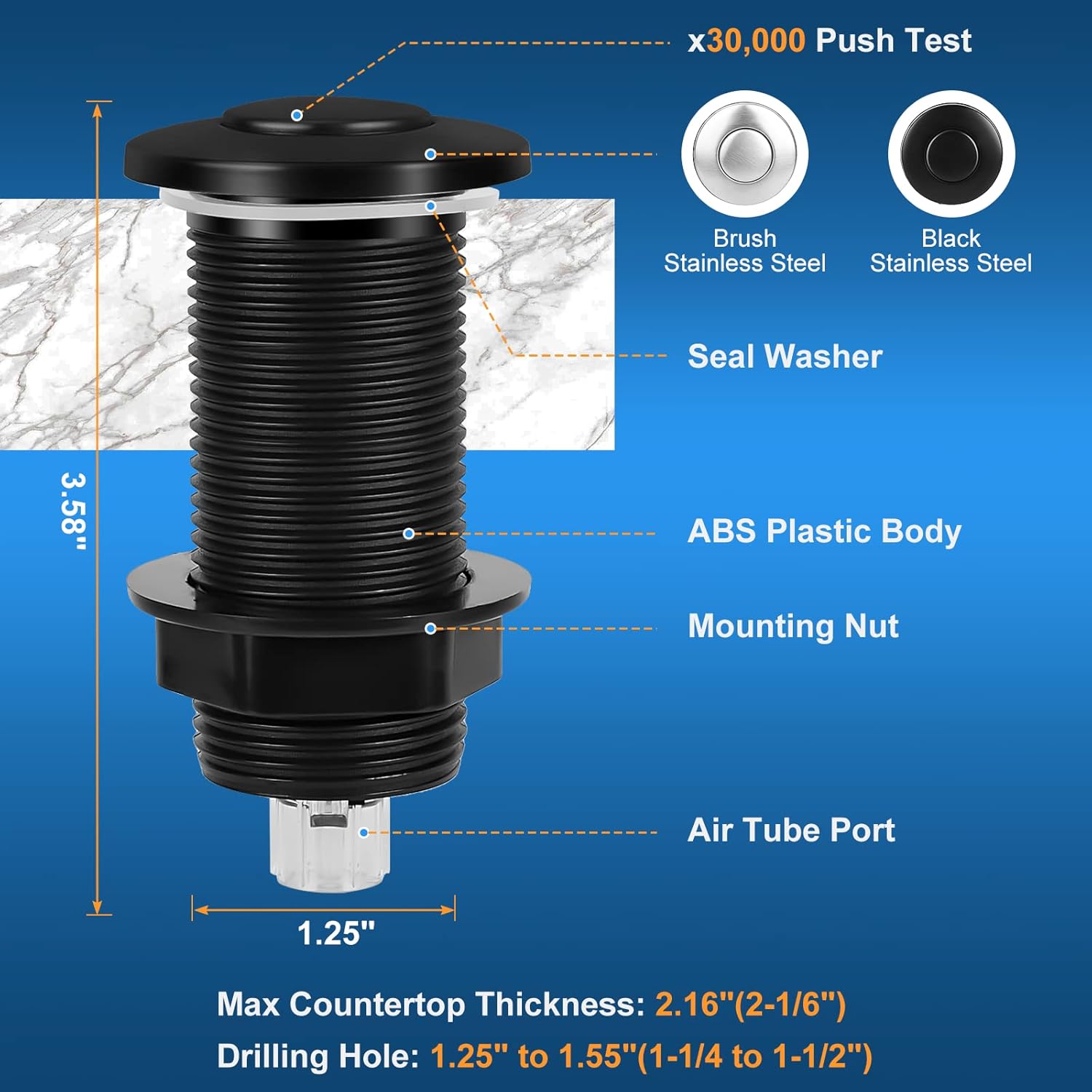 - 3.58” Extra Long for Any Countertop: The air switch button is 3.58” long, which fits any stainless steel sinktop and thicker countertops, like marble, quartz and granite, much wider applicable than those short 2.5” ones for stainless steel countertop only.