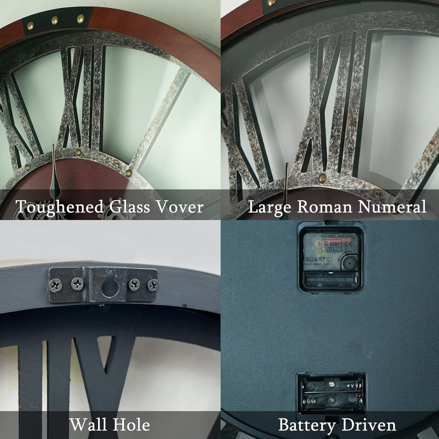 - 🙪Easy to Use: Clock living room decor is simple to operate, with independent pointers and gears powered by easily replaceable AA batteries. We recommend using carbon batteries for optimal performance.