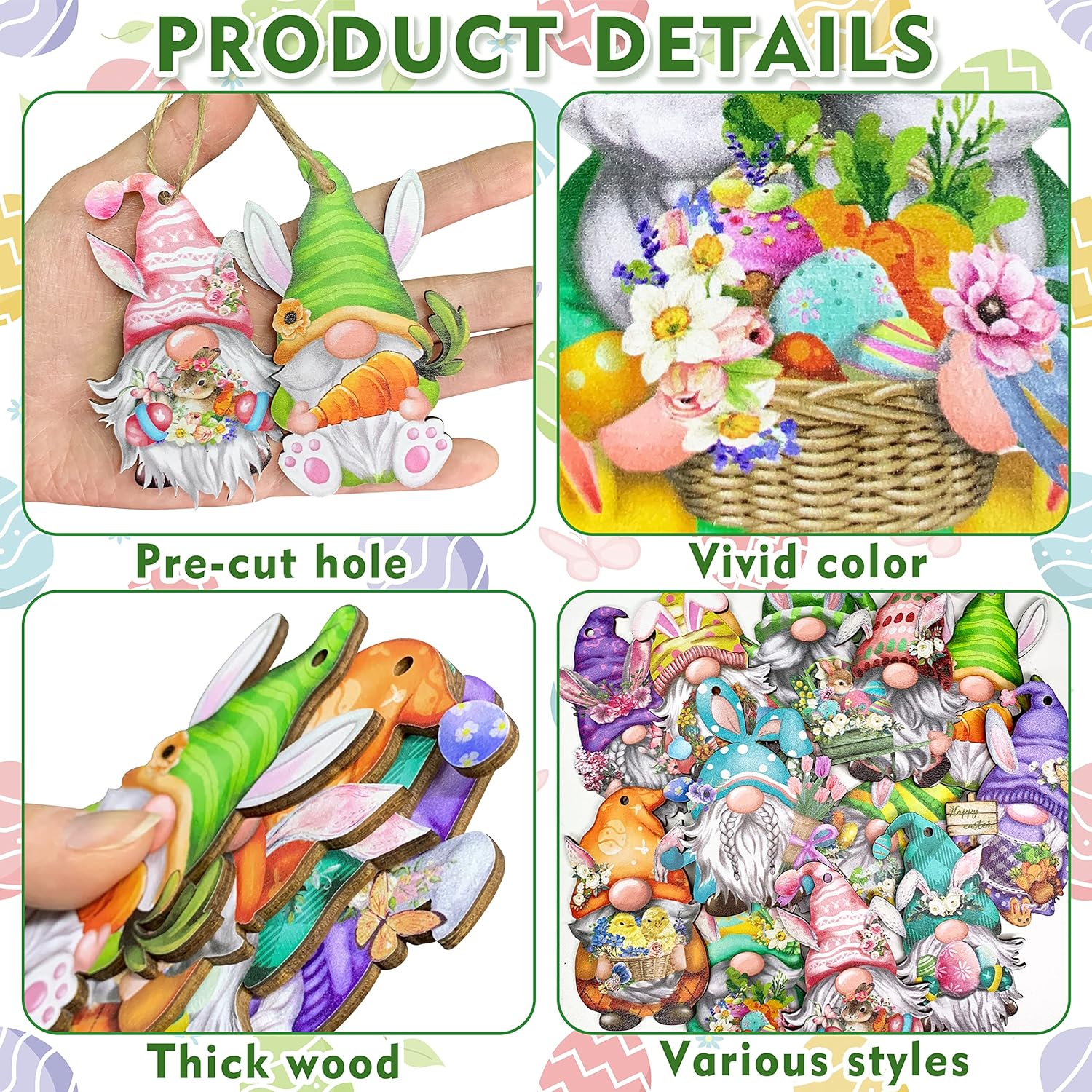 - New Designed Easter Gnome Wooden Ornaments -- 24 PCS gnome wooden slices with exquisite workmanship in 12 different styles are made of high-quality wood, painting in front and empty at back.