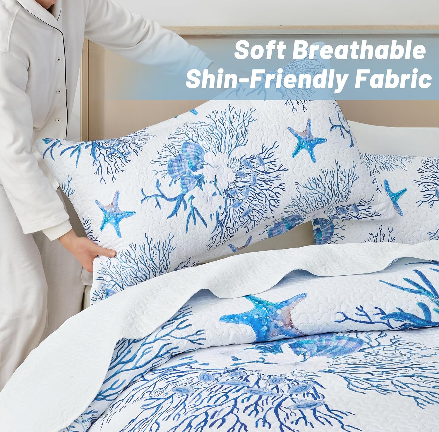 Coastal Bedding Queen Size Coastal Quilt with 2 Shams, Nautical Beach Comforter Sets Ocean Bedspreads Blue Starfish Coverlet Summer Bedding, 90''x96''
