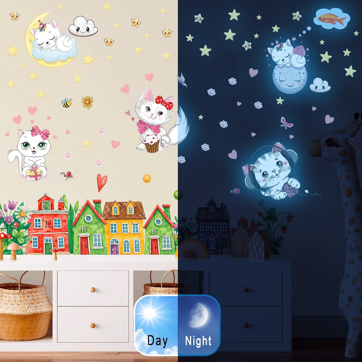 Glow in The Dark Stars for Girl's Room, Glowing Cats Cartoon Wall/Ceiling Decals, Kitten Butterflies Stickers for Kids Bedroom, Luminous Wall Decor for Nursery (Blue)