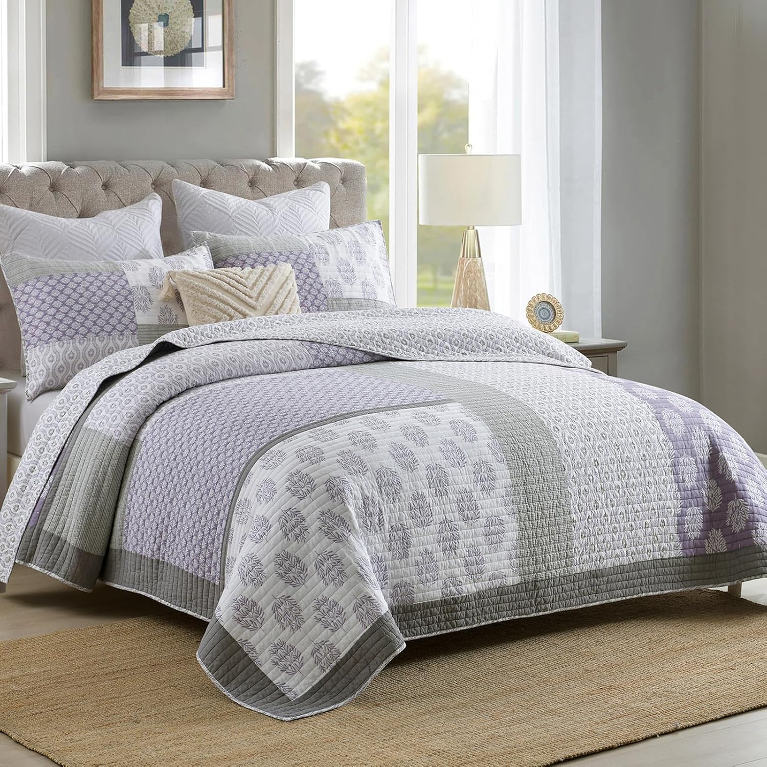 PANGUSHAN Quilt Set King Size, 100% Cotton Bedspread Quilt Bedding Set, Patchwork Reversible Floral Quilt for King Bed, Purple/Grey/White Bed Spread, Lightweight Comforter for All Season, 3 Pieces