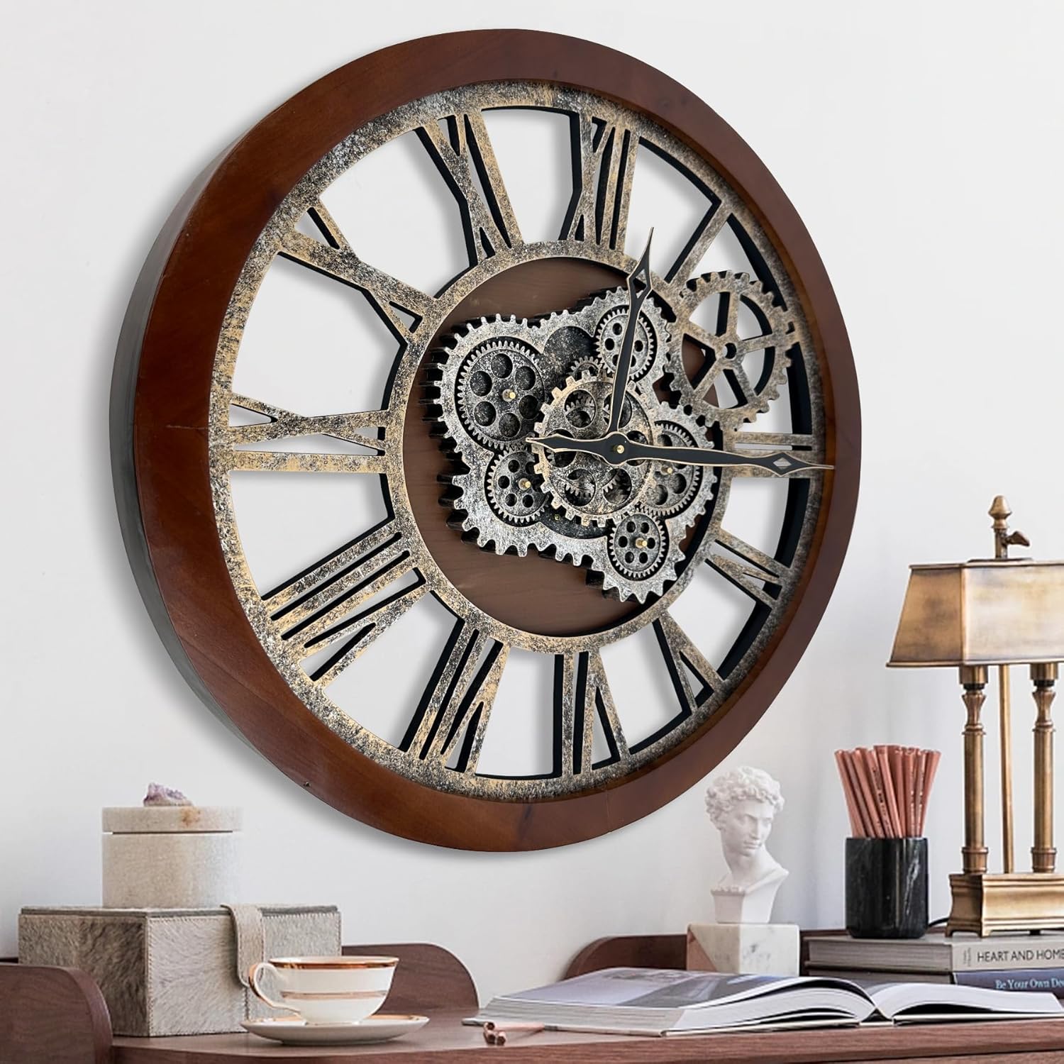 - 【Real Moving Gear Clock】All gears for the wall clock are real moving! Design with rustic bronze-color and industrial style. An creative combination of four gears for a retro look, has a very exquisite decorative effect makes the wall clock become a chic art works. The large wall clock crafted of nature wood & MDF. Big roman numeral numbers and wood rustic moving gears perfect for any room decor.