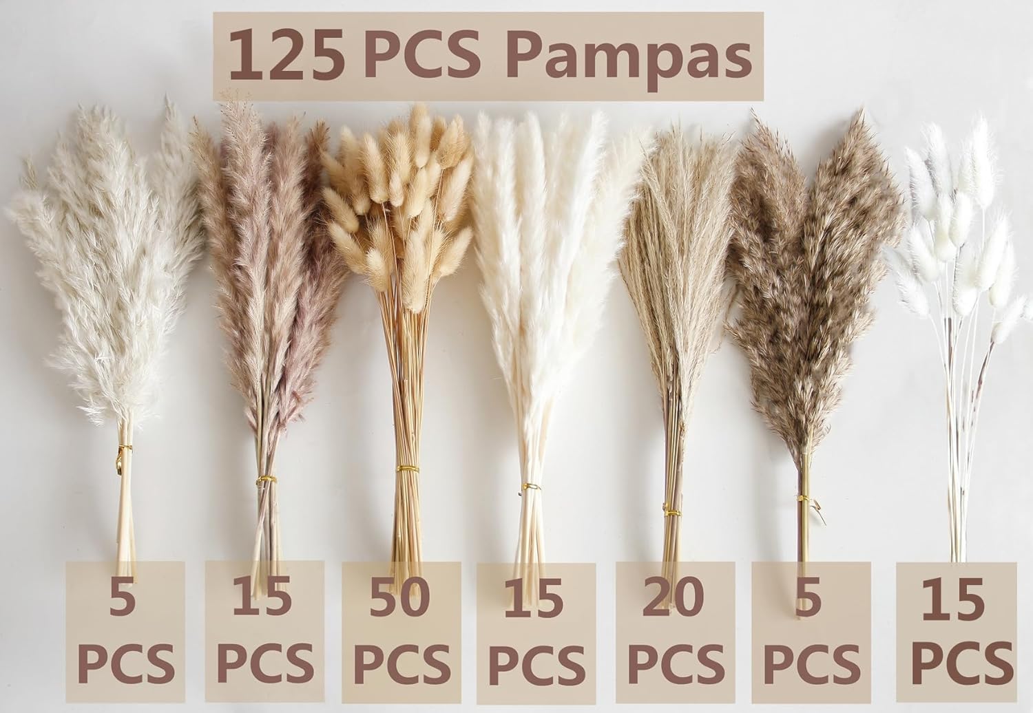 - 7 Varieties of Dried Florals: Our pampas grass bouquet bulk includes 50 nature bunny tails dried flowers, 15 White bunny tails dried flowers, 20 mini reed grass, 15 white pampas, 15 brown pampas, 5 white reeds, and 5 brown reeds, totaling 125 pieces. This quantity is more than sufficient.