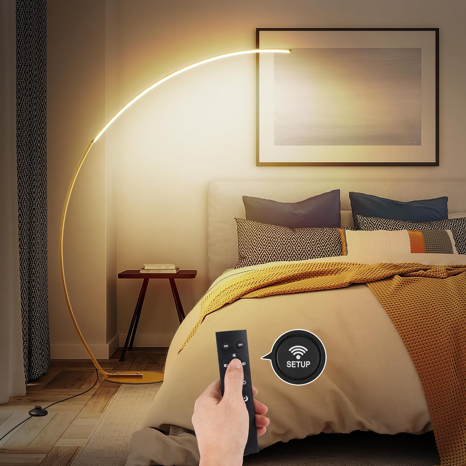 NUÜR Arc Floor Lamp, 67" Tall Gold LED Modern Standing Floor Lamp with Remote Control, Arched Bright Floor Lamps for Living Room Bedroom Office Home