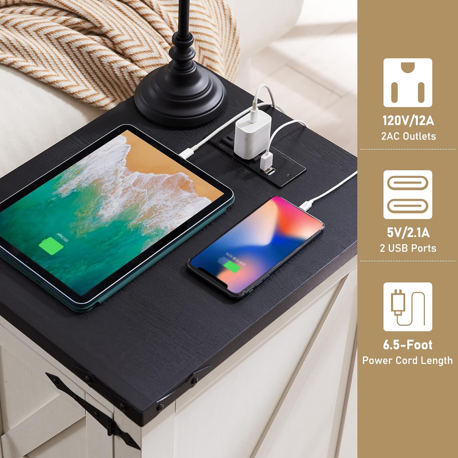 JXQTLINGMU Nightstand with Charging Station, Rectangular Farmhouse End Table with Barn Door and Adjustable Storage Shelf, 17" Deep Wood Rustic Sofa Side Table for Living Room, Bedroom, White