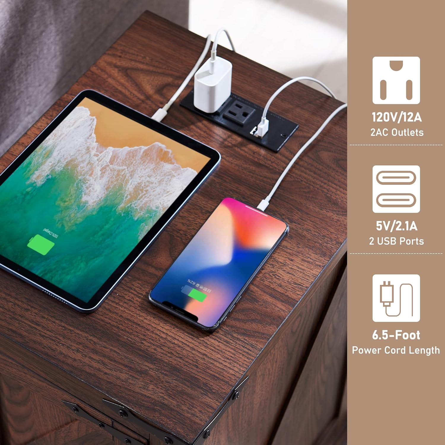 - CHARGING STATION TABLE: This end table with charging station is equipped with 2 Standard AC Outlets and 2 USB ports, with two 2.3"round holes at the back for organizing the cords, which makes the desk neater while providing convenience for charging your devices such as cell phones, tablets, and earphones. A great addition to your home, making your house more orderly