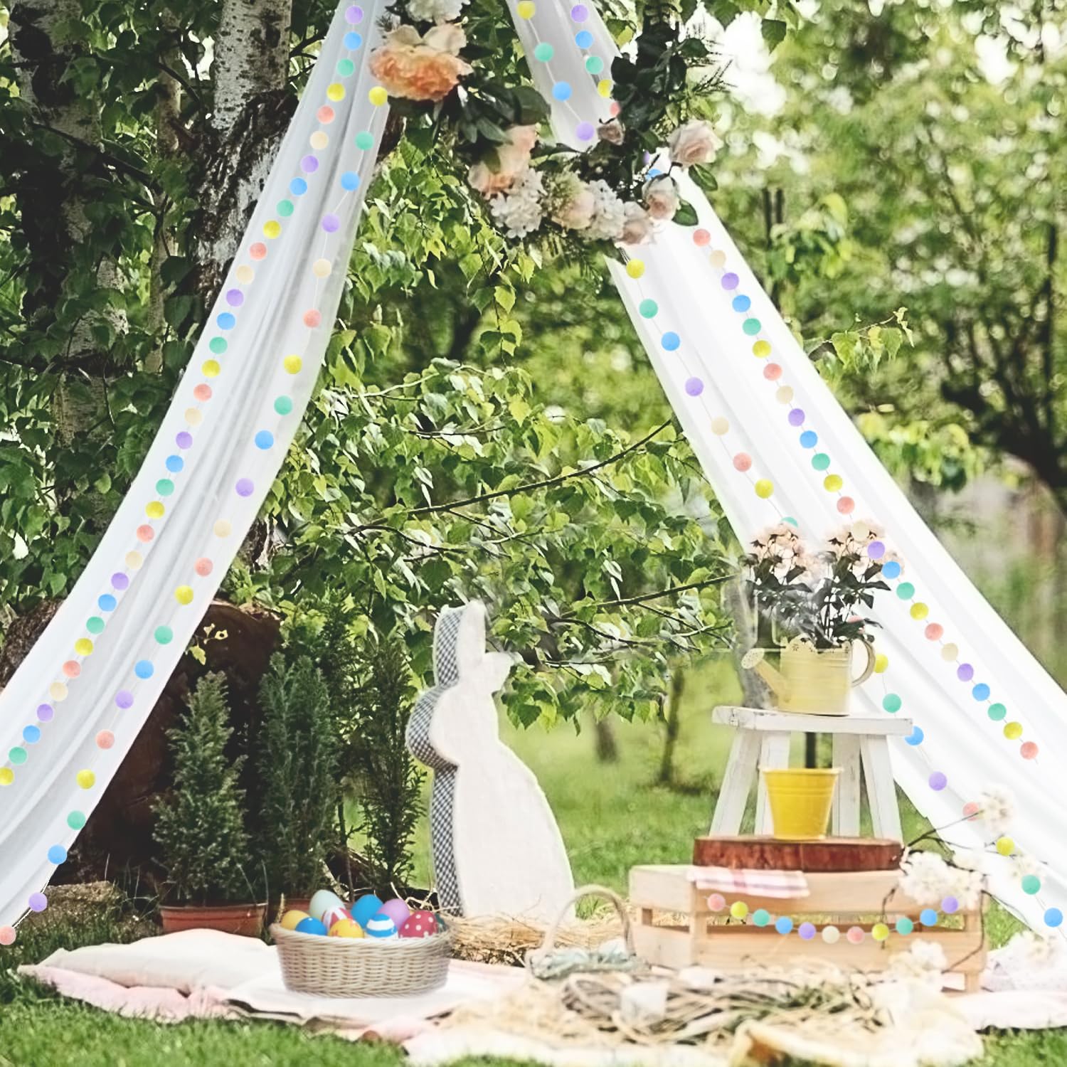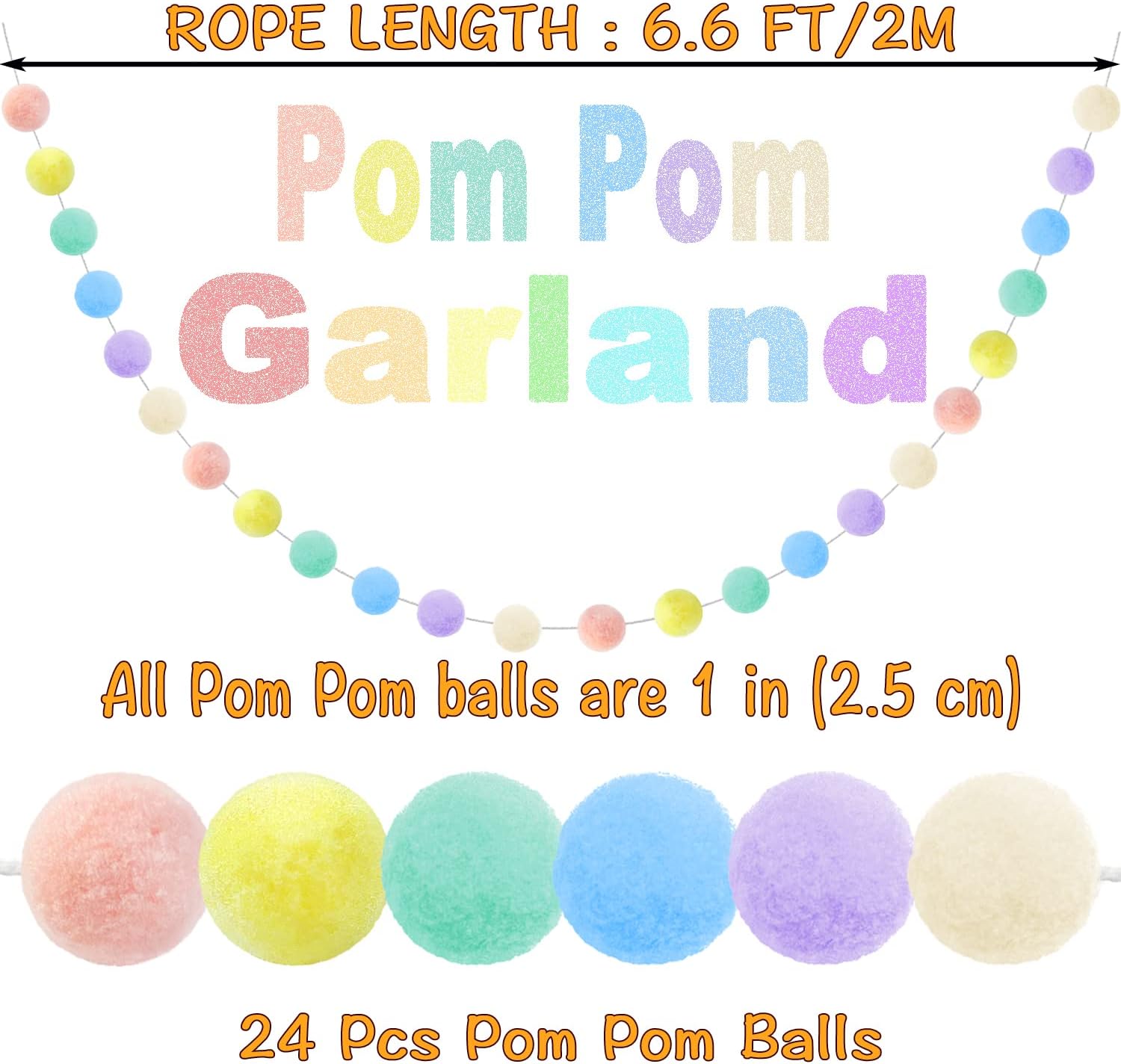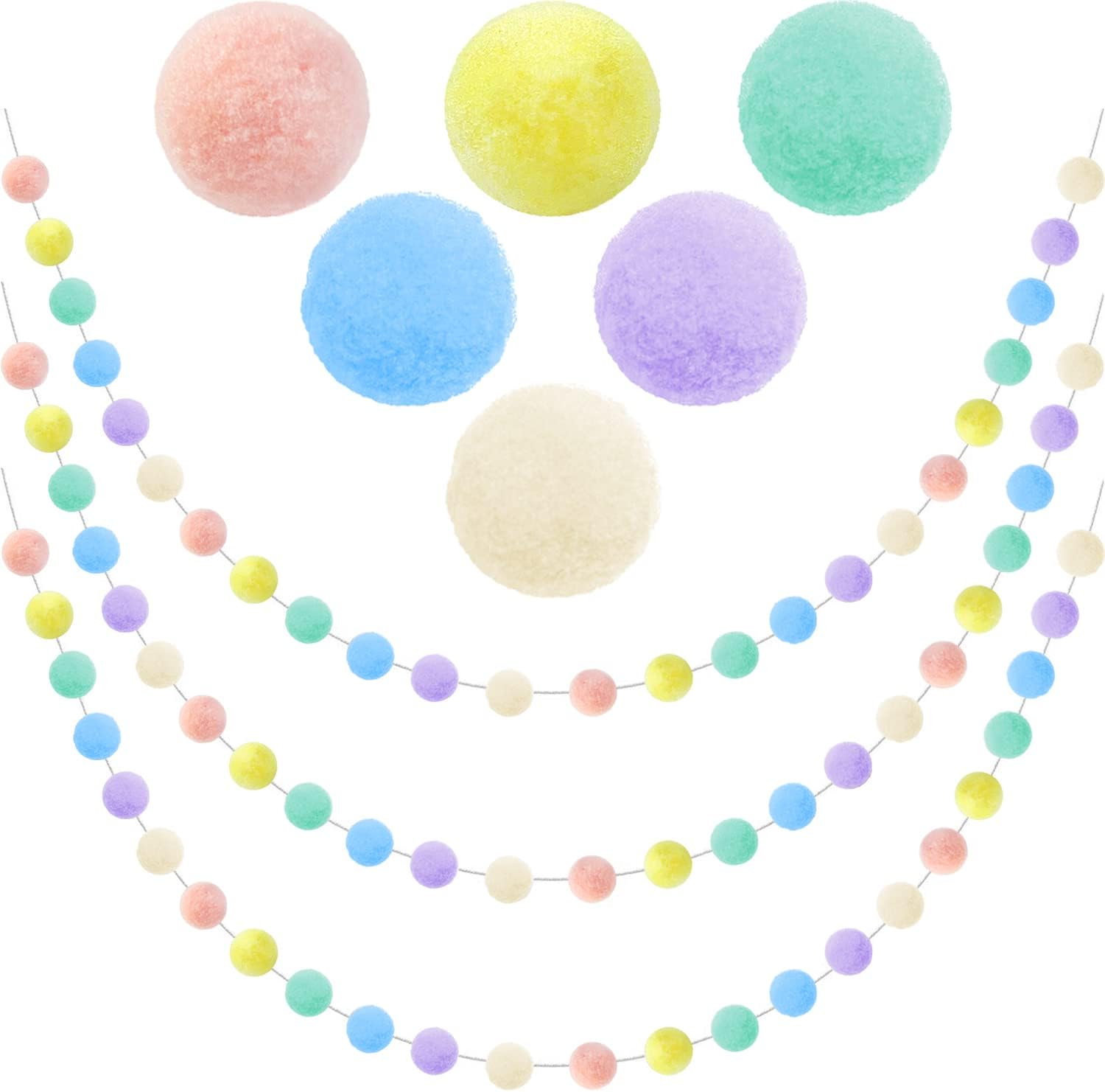 - PASTEL EASTER DECORATIONS GARLAND PACK OF 3: Our Pom Pom Garland contains 24 Pom Pom Balls, the felt Pom Pom Garland is 6.6 feet/ 2m long and the Pom Pom Ball is 25mm in diameter, no knots in the felt garland, so the distance between felt balls and the total length can be adjusted. Our set contains 3 strands of elegant felt ball garland, meeting your daily, Christmas festive holiday, birthday or parties decoration needs. NOTE: Winding Risk May Exist, Please Keep Away from Kids Under 3 Years Old.