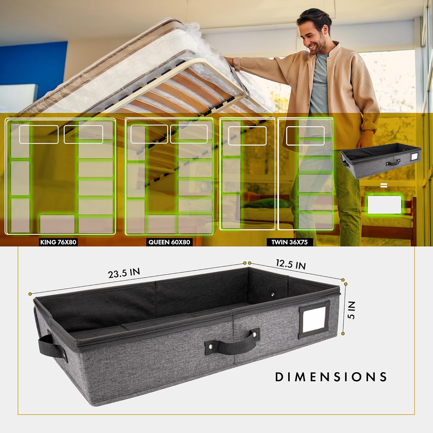 - 𝟑𝟎𝟎𝐃 𝐂𝐚𝐭𝐢𝐨𝐧𝐢𝐜 𝐂𝐥𝐨𝐭𝐡 𝐌𝐚𝐭𝐞𝐫𝐢𝐚𝐥: Made from premium quality fabric, our 23.5x12.5x5" Under Bed Storage Containers With Lids are durable, sturdy, & carefully designed to hold large quantities of clothes, blankets, shoes, & various bed accessories. These under bed storage dorm drawers are designed to fit perfectly under your bed for efficient bed room organization and storage, making it an under bed organizer that will easily blend into your home's aesthetic style.