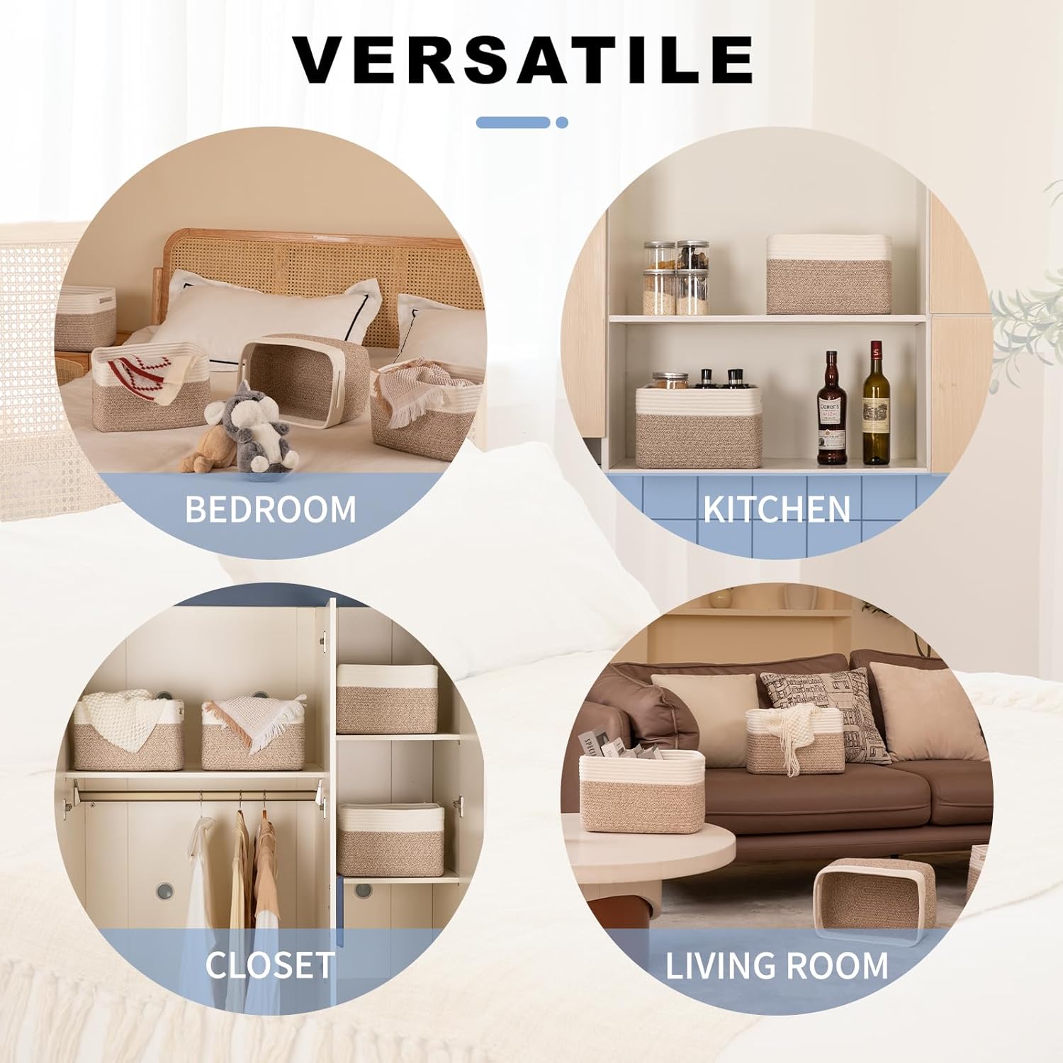 - Stylish and Elegant: SIXDOVE Cotton Rope Storage Basket. The woven design of these baskets adds a touch of rustic charm to any room decor, making them a perfect addition to your living room, bedroom, bathroom, or nursery. These cube rope storage baskets enhance any room or decor of your home