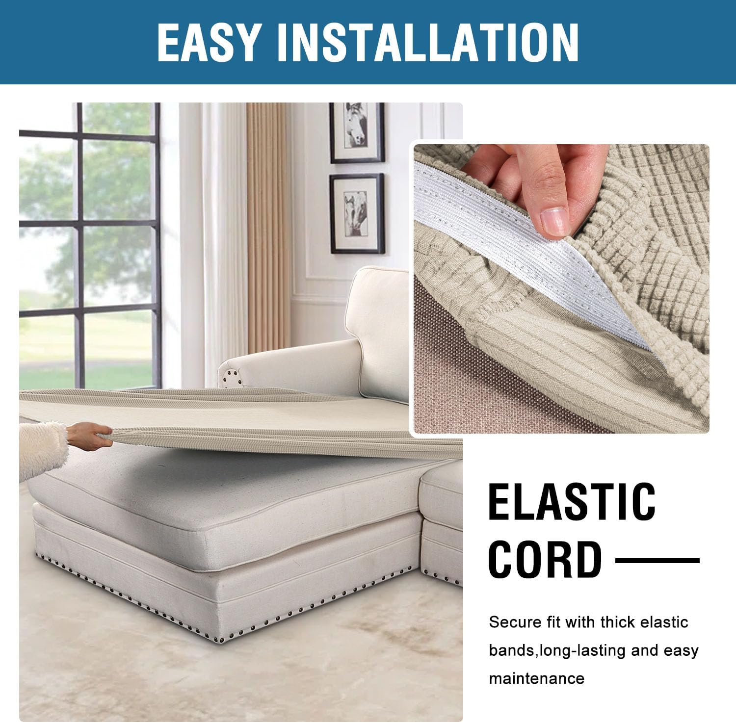 - NON SLIP: Effortless for installation (guide photos on selling page), sewn with thick elastic loops to cover the bottom edges. It is easy to install and take off, making your home more harmony, high recommended for both leather and cloth furniture