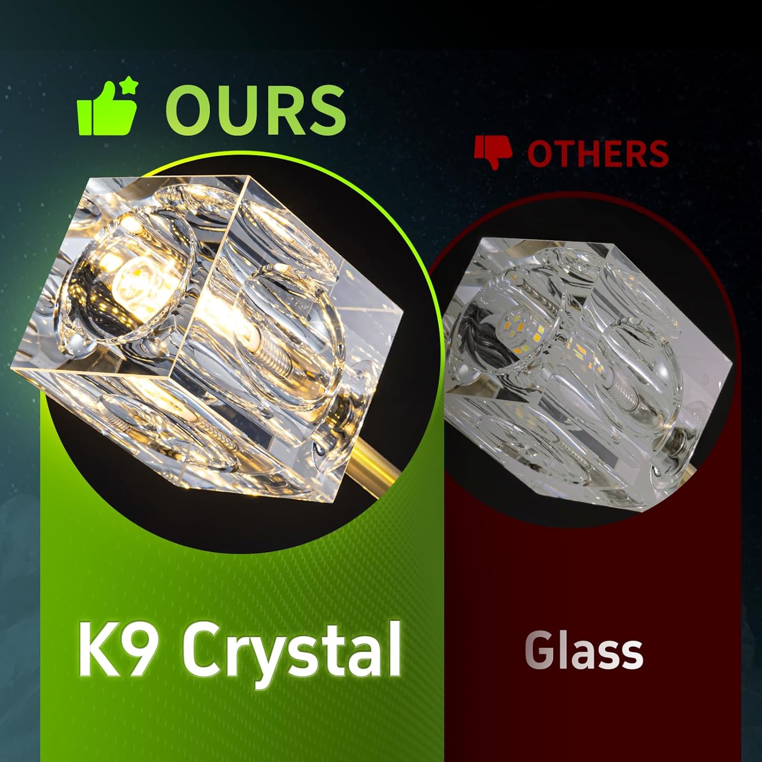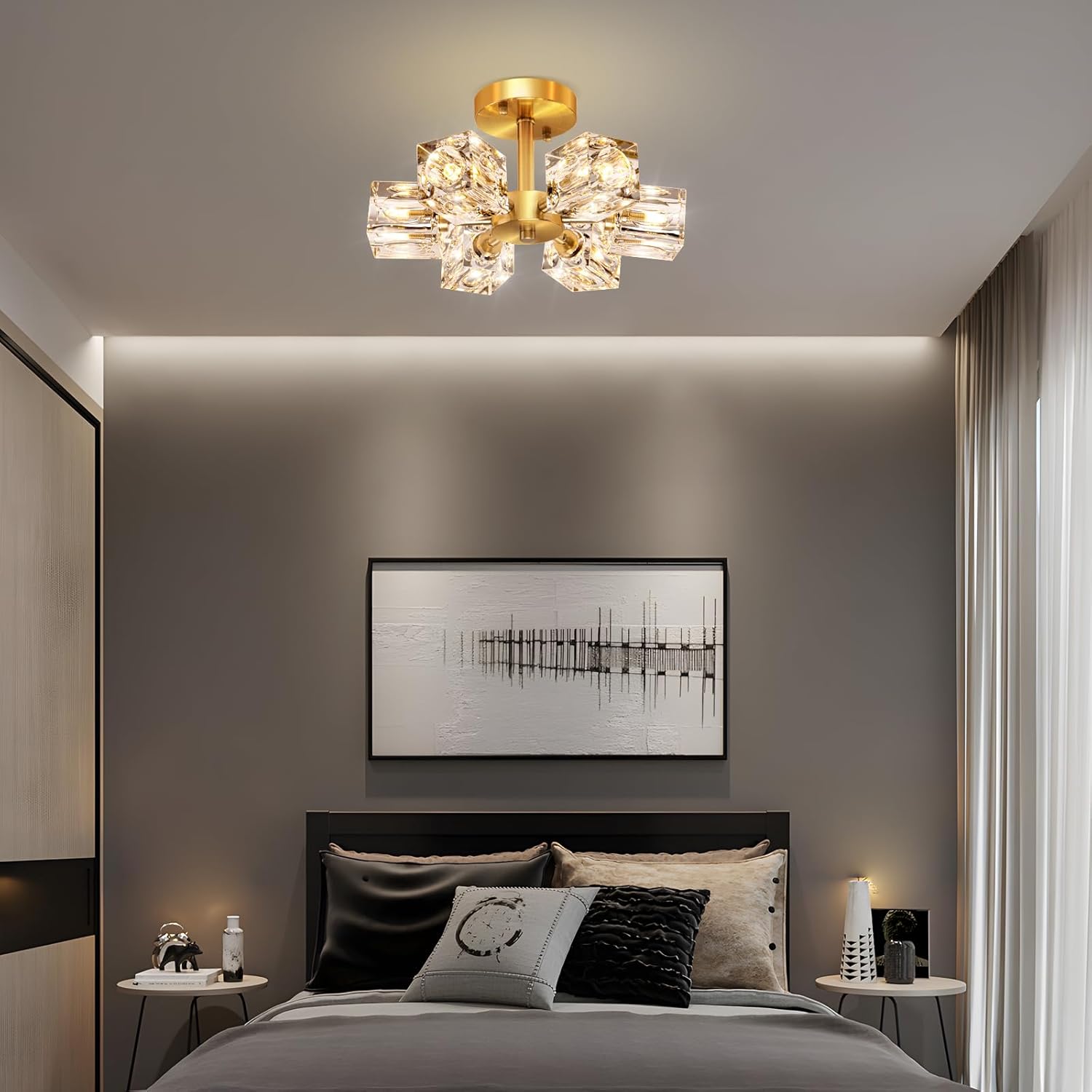 - 【K9 Crystal Sputnik Chandelier Design】The gold semi flush mount ceiling light is made of clear K9 crystal lampshade and high-quality brass lamp body, the cube crystal lampshade is matched with gold lamp body, and lighting is reflected through the clear crystals which is bright and charming, making your home reveals a low-key and elegant atmosphere.