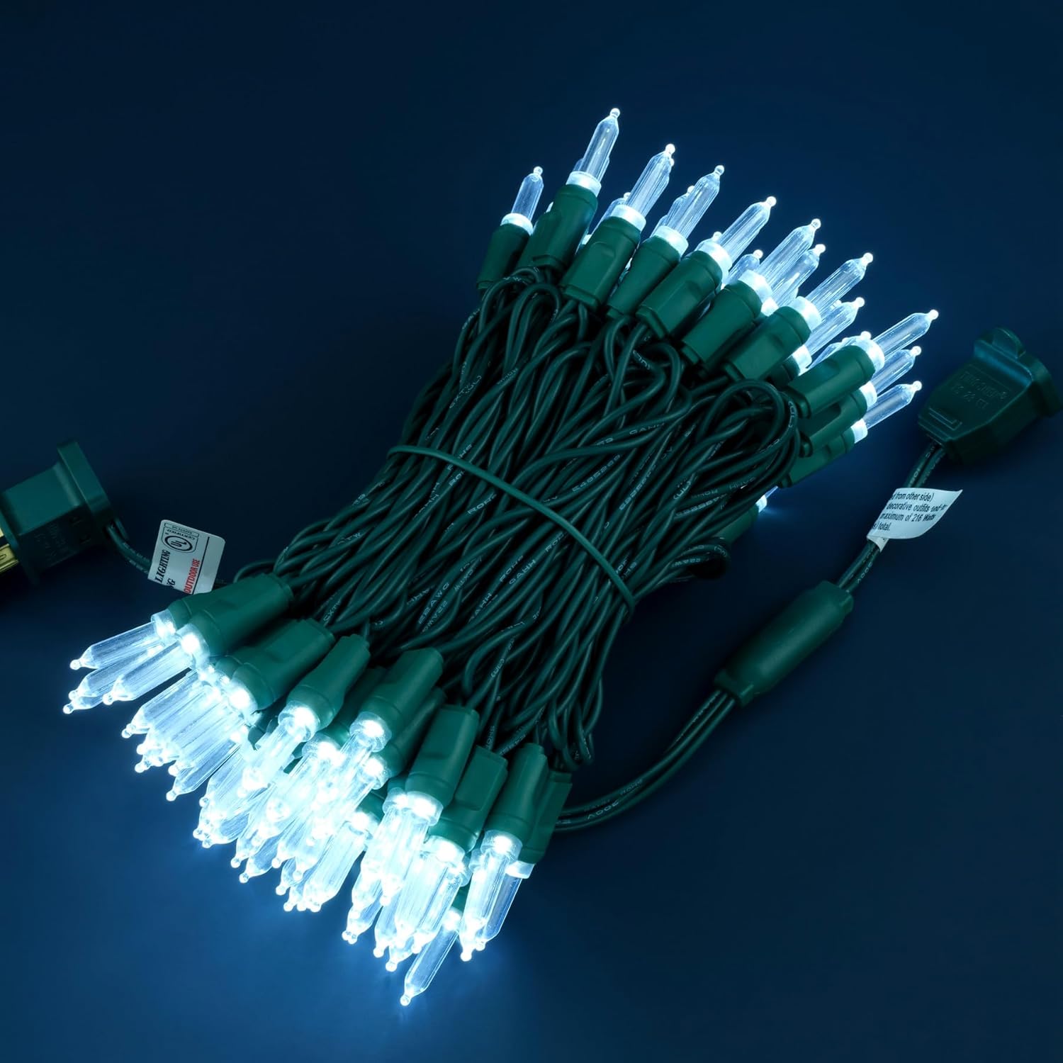 - SPECIFICATIONS ☀ Each pack contains 1 strands of one-piece string lights, total length 33 feet with 100 count cool white mini lights. 22 AWG green cord, 4" lead, 4" spacing, 4" tail.