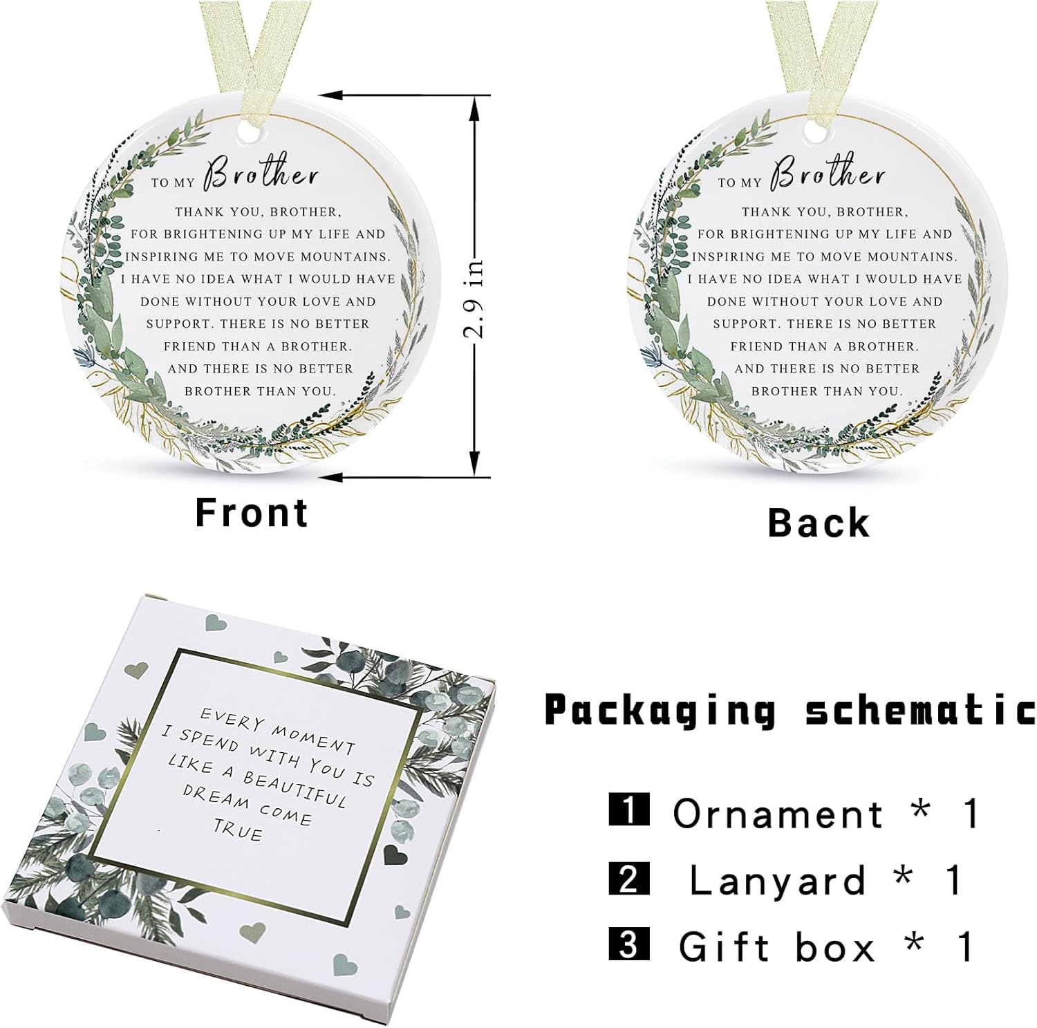- 🌼【Perfect and delicate size】This is a brother memory ornament with a diameter of 2.9 inches and a thickness of only 0.18 inches. The product includes: a round brother ornamentt*1, a gift box*1 and a lanyard*1. The gift box comes with it makes it easy for you to give the best brother ever gifts directly to family and friends and other special people in your life, and the lanyard that comes with it helps to hang it easily on the Christmas tree or anywhere you want.