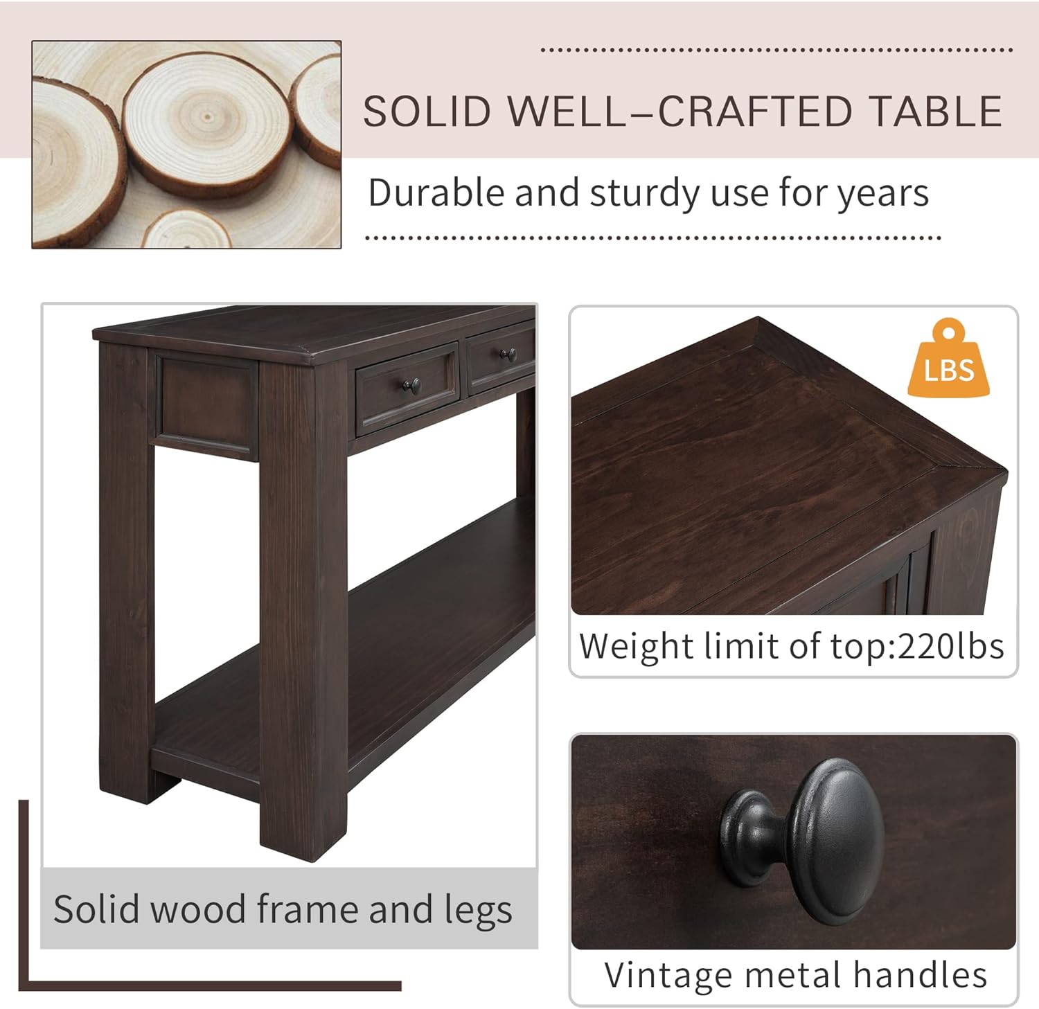 63" Solid Wood Console Table Sofa Table with Storage Drawers and Bottom Shelf,Farmhouse Entryway Table for Hallway Foyer,Sofa Couch Table,Fully Assembled (63" Espresso)