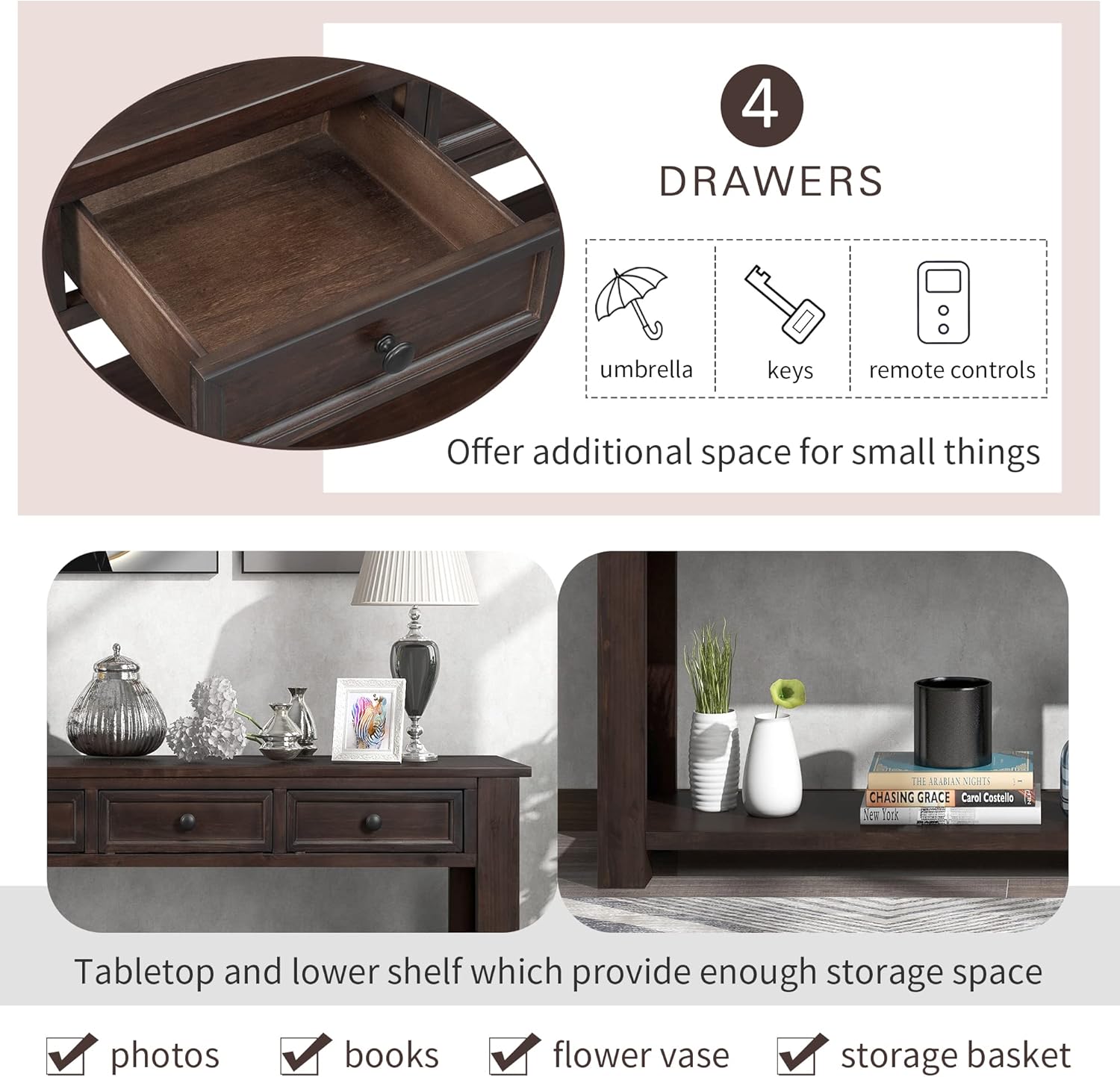 - 🌳【Console Table with Drawers and Shelves】This sofa table has drawers and bottom partitions to give you plenty of storage space to sort and store different items. Perfect for displaying decorations such as paintings, photos, flowers and other things you can think of