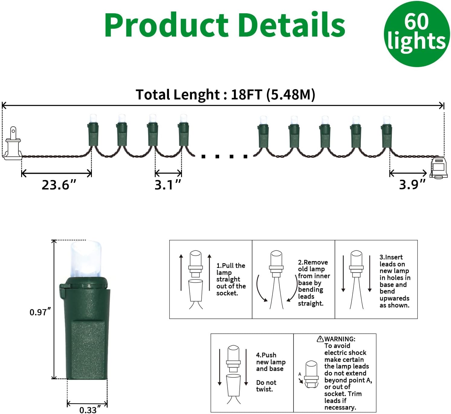 - 5mm LED Christmas Lights: 60 counts white 5mm wide angle stable LED string lights spaced 3.1 inches apart with green wire. 23.6 inch leads have a stackable male plug and 3.9 inch tails have a female plug for easy end to end connection.