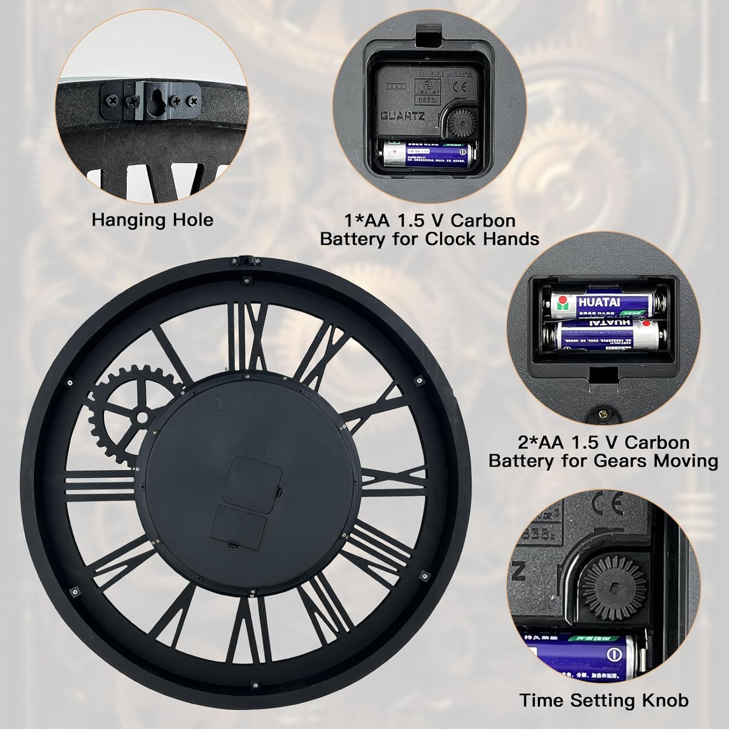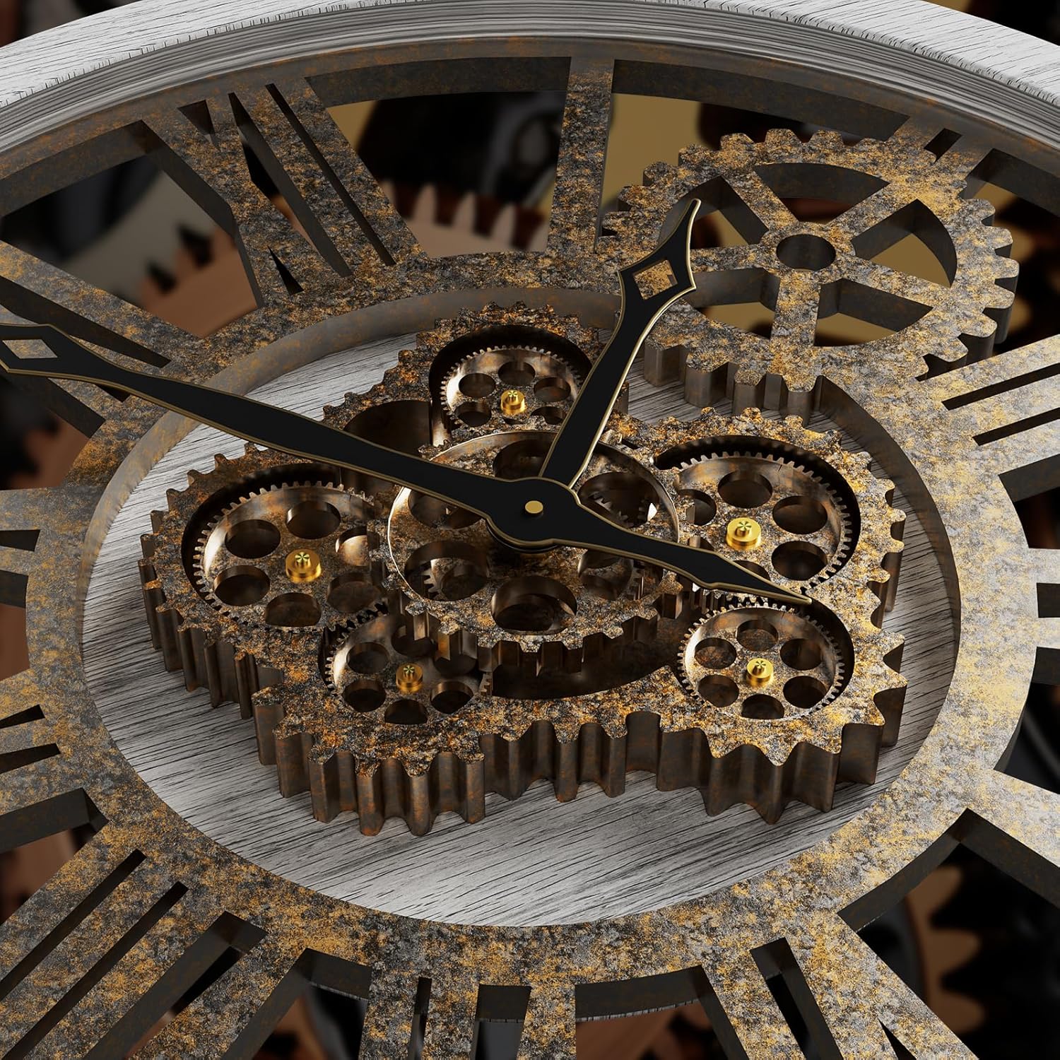 - REAL MOVING GEARS: Large wall clock with unique moving parts is as attractive as it is functional. Put batteries in, various gears start rotating fluently. Moving gear wall clock is amazing looking on the wall and will get so many compliments on it. Made from solid wood and painted by Rust-like color on wall clock create a very rustic and industrial atmosphere. Farmhouse wall clock is professionally handmade and pursuit of naturalness, so it may have some little imperfections
